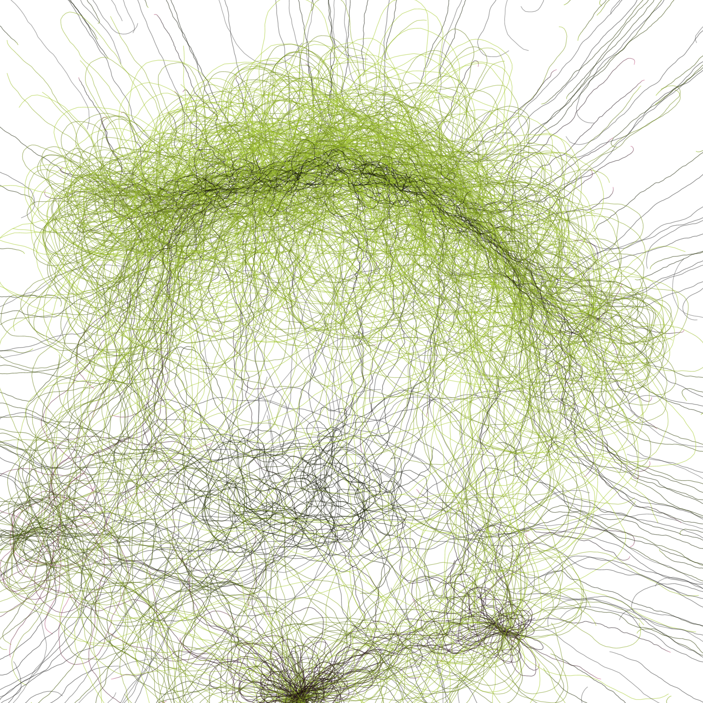 “Phototaxis” is a simulated environment populated by simple machines. After Valentino Braitenberg’s 1984 book “Vehicles,” there are four kinds of machines with different wiring and behaviors: Explorers, Aggressors, Lovers, and Cowards. Each line charts the history of one machine’s movement. The core of this code was the foundation for my MicroImage series of works dating back to 2001. I’ve worked on it in fits and starts since then, and in 2021 it was further developed for Art Blocks. Press ‘P’ to play/pause, ‘B’ for the big bang, ‘1’–’5’ to change the magnification, and ‘L’ to reveal the lights’ locations.