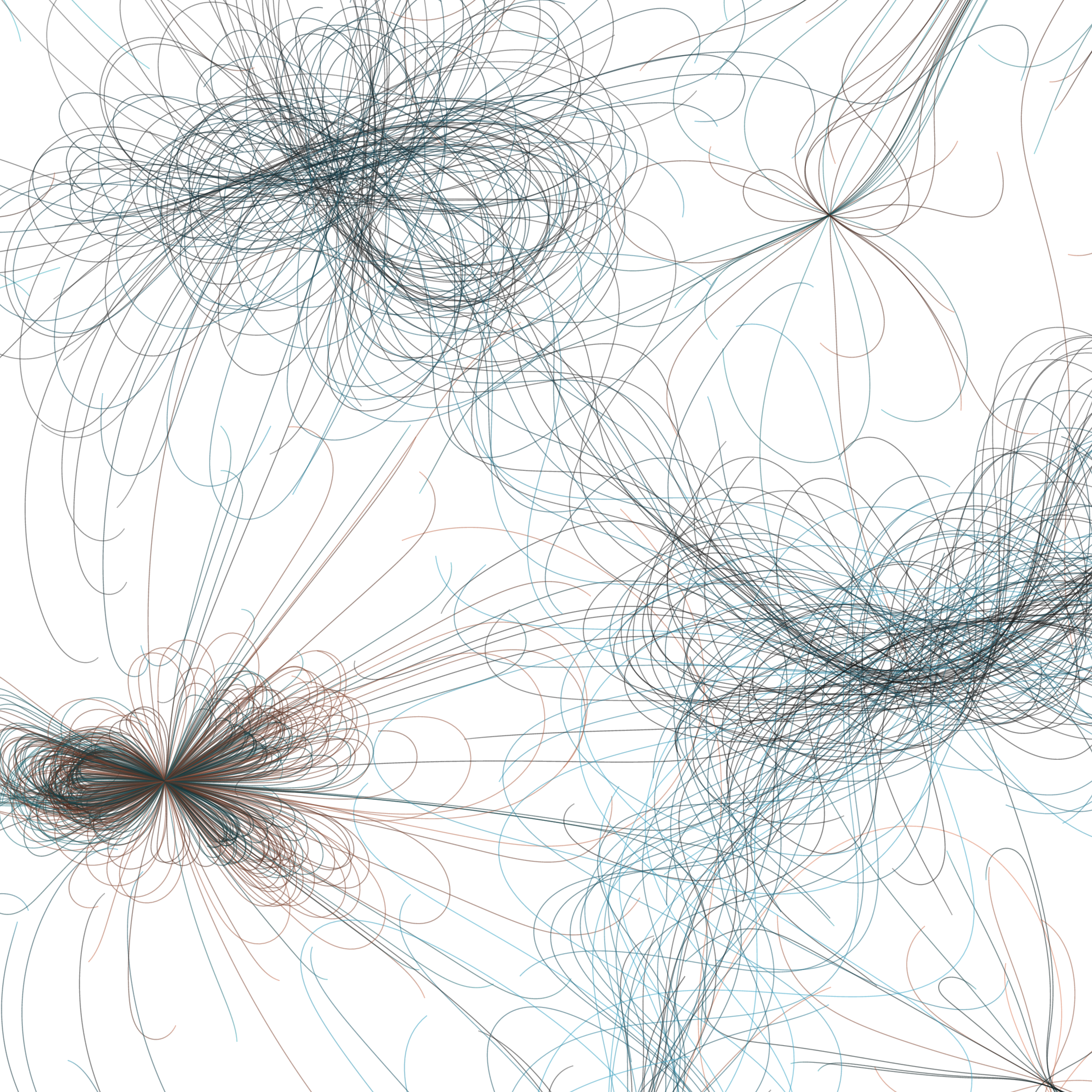 “Phototaxis” is a simulated environment populated by simple machines. After Valentino Braitenberg’s 1984 book “Vehicles,” there are four kinds of machines with different wiring and behaviors: Explorers, Aggressors, Lovers, and Cowards. Each line charts the history of one machine’s movement. The core of this code was the foundation for my MicroImage series of works dating back to 2001. I’ve worked on it in fits and starts since then, and in 2021 it was further developed for Art Blocks. Press ‘P’ to play/pause, ‘B’ for the big bang, ‘1’–’5’ to change the magnification, and ‘L’ to reveal the lights’ locations.
