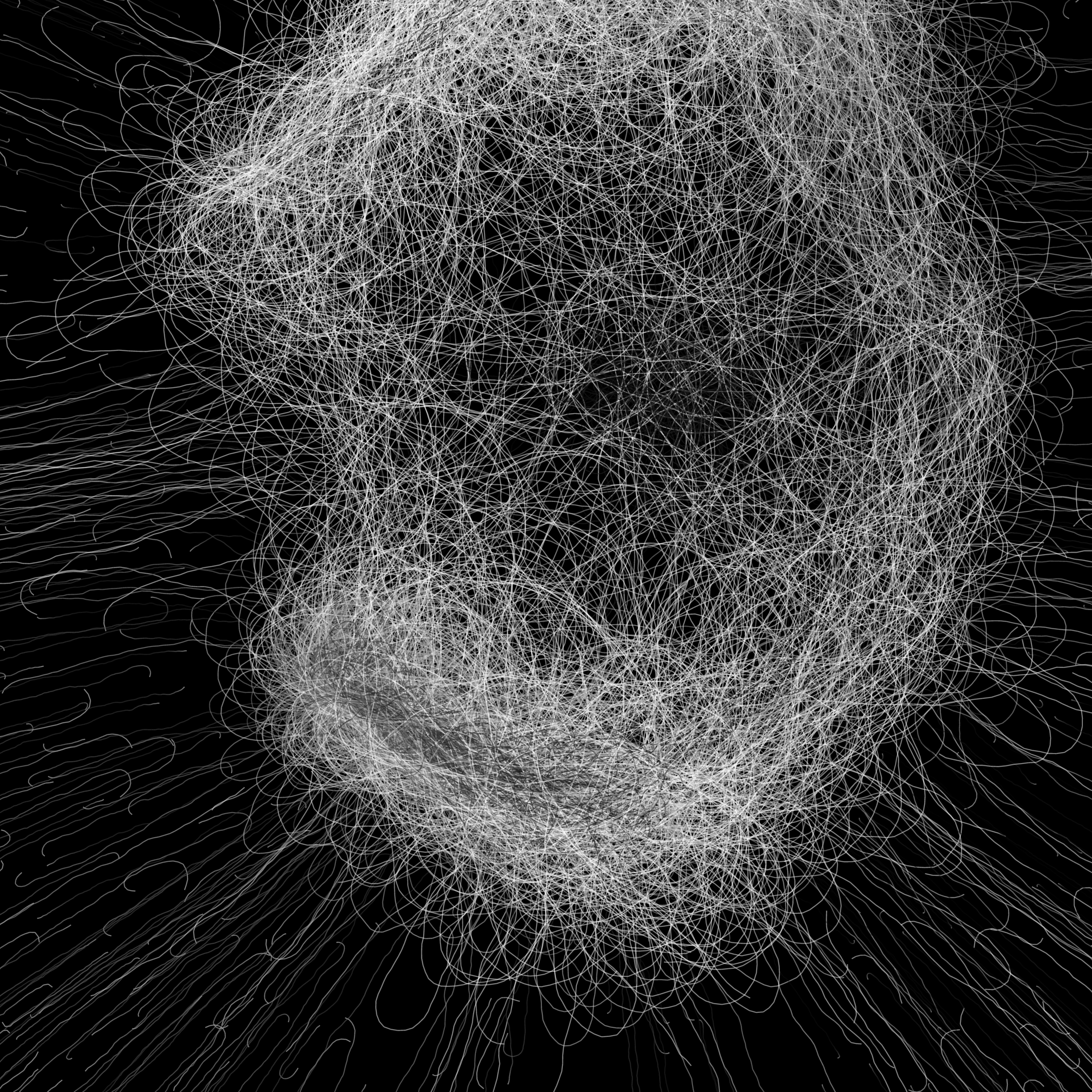 “Phototaxis” is a simulated environment populated by simple machines. After Valentino Braitenberg’s 1984 book “Vehicles,” there are four kinds of machines with different wiring and behaviors: Explorers, Aggressors, Lovers, and Cowards. Each line charts the history of one machine’s movement. The core of this code was the foundation for my MicroImage series of works dating back to 2001. I’ve worked on it in fits and starts since then, and in 2021 it was further developed for Art Blocks. Press ‘P’ to play/pause, ‘B’ for the big bang, ‘1’–’5’ to change the magnification, and ‘L’ to reveal the lights’ locations.