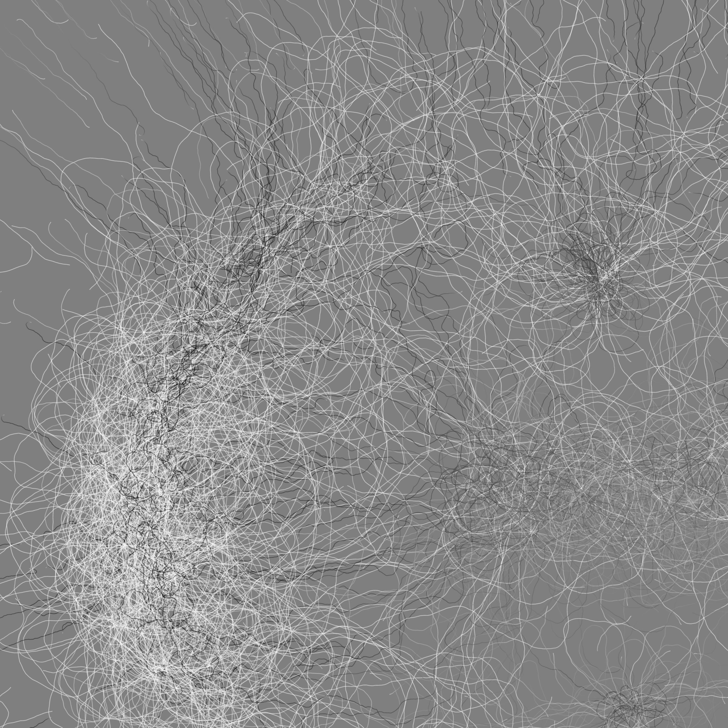 “Phototaxis” is a simulated environment populated by simple machines. After Valentino Braitenberg’s 1984 book “Vehicles,” there are four kinds of machines with different wiring and behaviors: Explorers, Aggressors, Lovers, and Cowards. Each line charts the history of one machine’s movement. The core of this code was the foundation for my MicroImage series of works dating back to 2001. I’ve worked on it in fits and starts since then, and in 2021 it was further developed for Art Blocks. Press ‘P’ to play/pause, ‘B’ for the big bang, ‘1’–’5’ to change the magnification, and ‘L’ to reveal the lights’ locations.