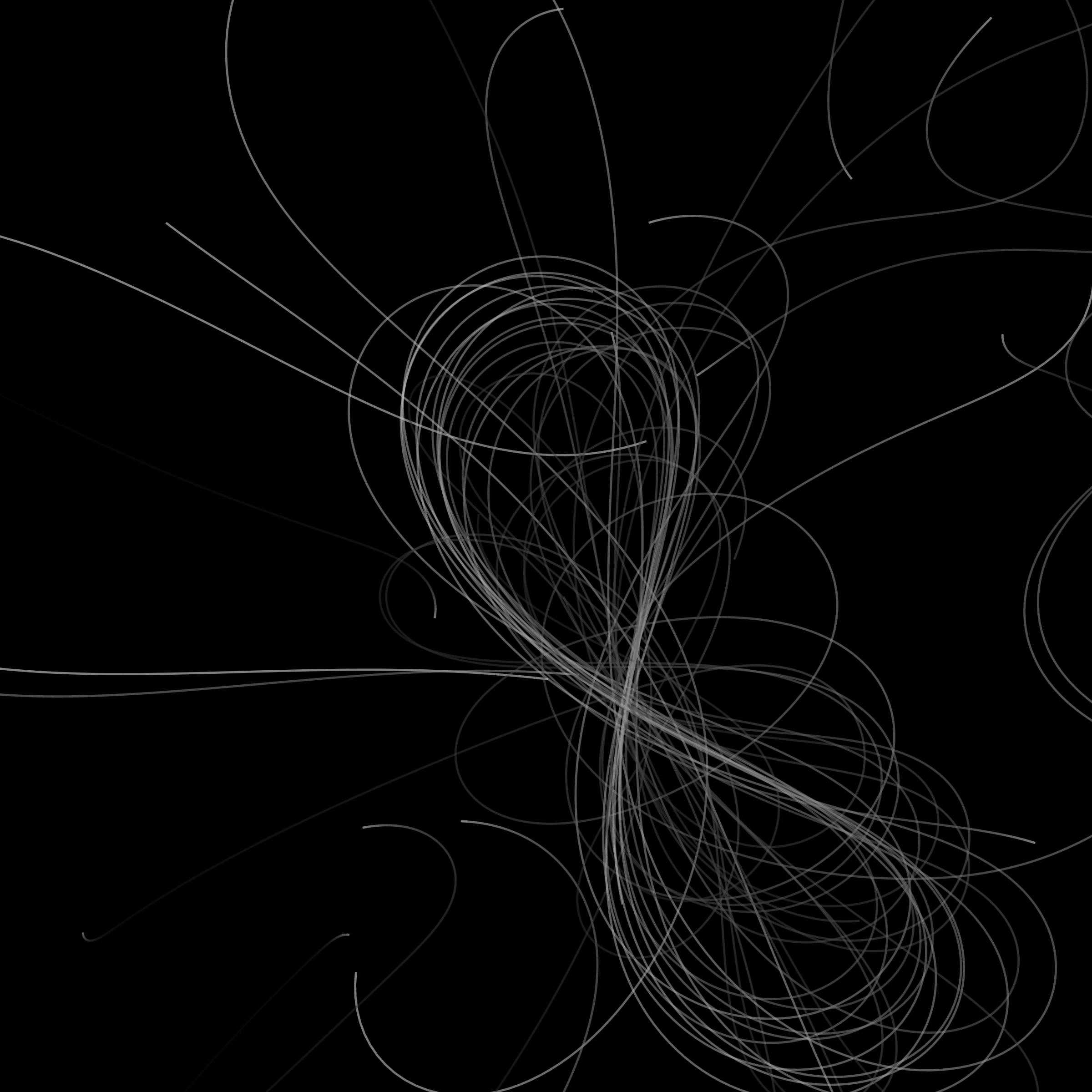 “Phototaxis” is a simulated environment populated by simple machines. After Valentino Braitenberg’s 1984 book “Vehicles,” there are four kinds of machines with different wiring and behaviors: Explorers, Aggressors, Lovers, and Cowards. Each line charts the history of one machine’s movement. The core of this code was the foundation for my MicroImage series of works dating back to 2001. I’ve worked on it in fits and starts since then, and in 2021 it was further developed for Art Blocks. Press ‘P’ to play/pause, ‘B’ for the big bang, ‘1’–’5’ to change the magnification, and ‘L’ to reveal the lights’ locations.
