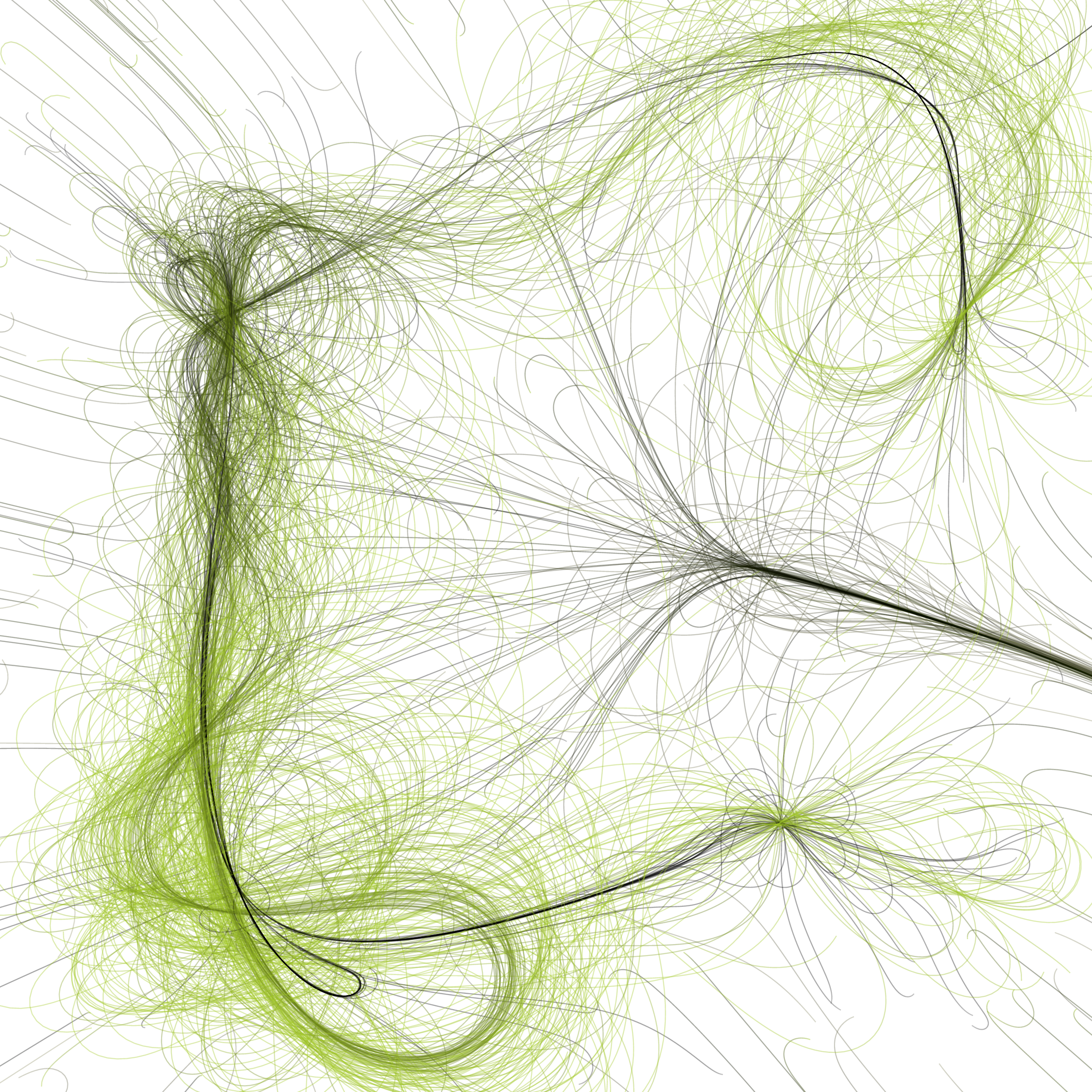 “Phototaxis” is a simulated environment populated by simple machines. After Valentino Braitenberg’s 1984 book “Vehicles,” there are four kinds of machines with different wiring and behaviors: Explorers, Aggressors, Lovers, and Cowards. Each line charts the history of one machine’s movement. The core of this code was the foundation for my MicroImage series of works dating back to 2001. I’ve worked on it in fits and starts since then, and in 2021 it was further developed for Art Blocks. Press ‘P’ to play/pause, ‘B’ for the big bang, ‘1’–’5’ to change the magnification, and ‘L’ to reveal the lights’ locations.