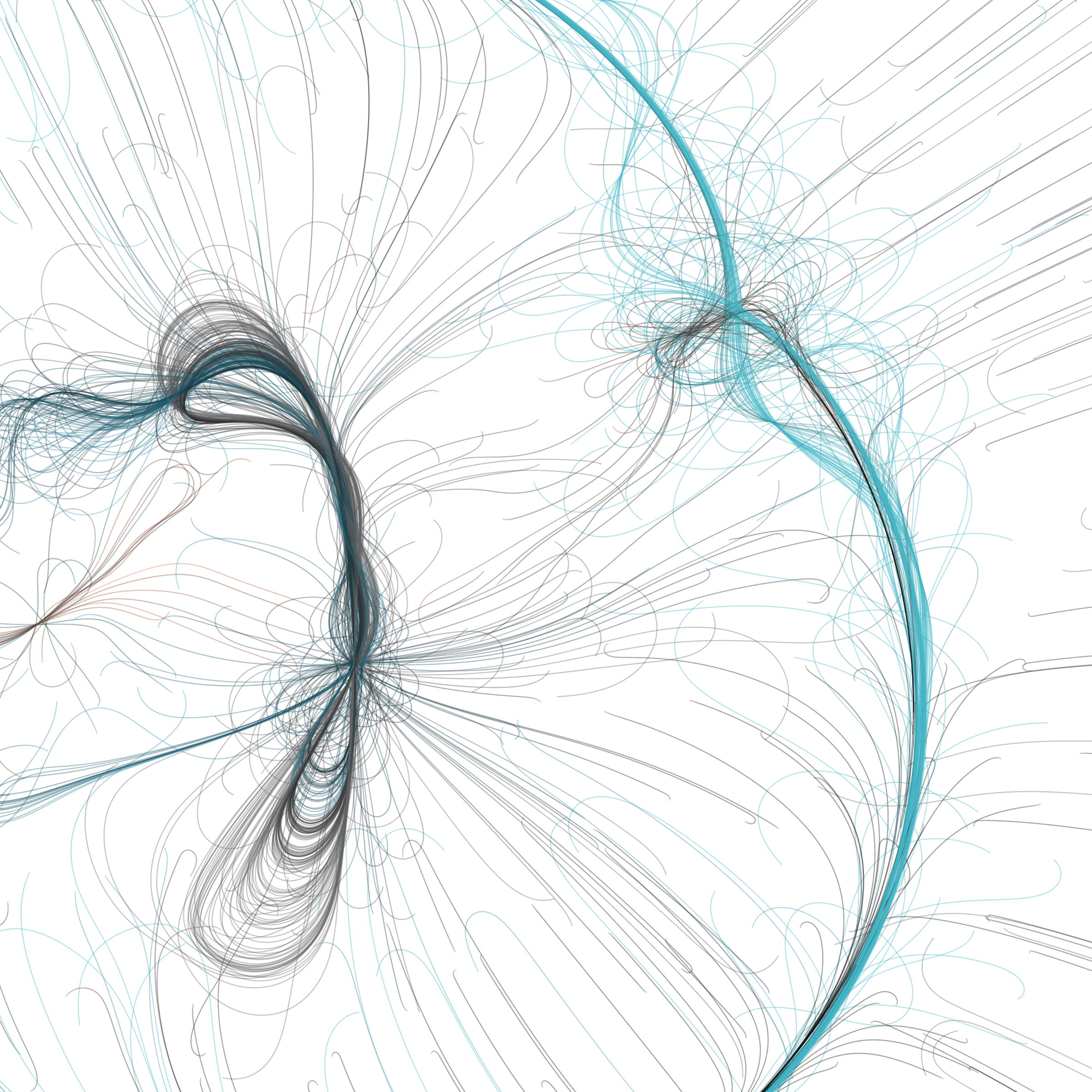 “Phototaxis” is a simulated environment populated by simple machines. After Valentino Braitenberg’s 1984 book “Vehicles,” there are four kinds of machines with different wiring and behaviors: Explorers, Aggressors, Lovers, and Cowards. Each line charts the history of one machine’s movement. The core of this code was the foundation for my MicroImage series of works dating back to 2001. I’ve worked on it in fits and starts since then, and in 2021 it was further developed for Art Blocks. Press ‘P’ to play/pause, ‘B’ for the big bang, ‘1’–’5’ to change the magnification, and ‘L’ to reveal the lights’ locations.