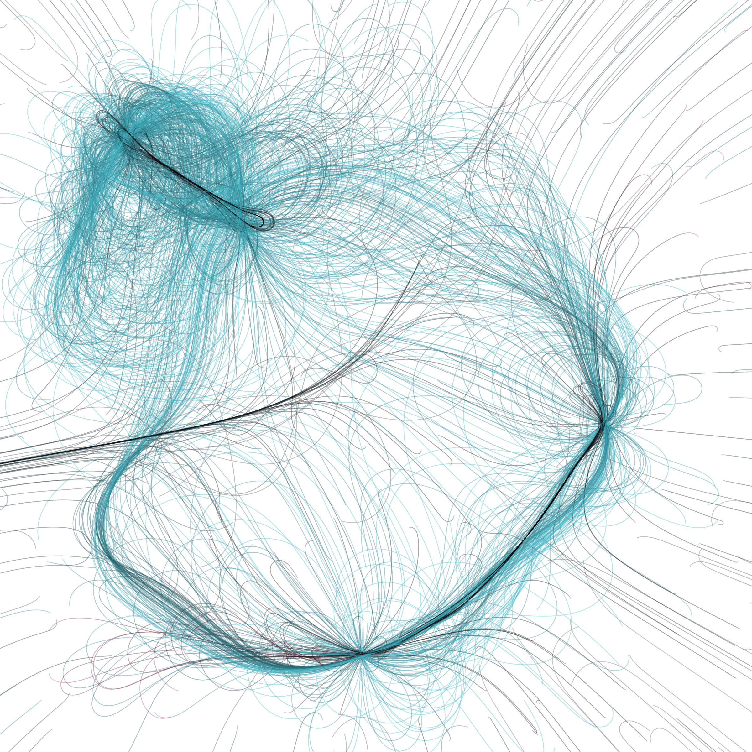 “Phototaxis” is a simulated environment populated by simple machines. After Valentino Braitenberg’s 1984 book “Vehicles,” there are four kinds of machines with different wiring and behaviors: Explorers, Aggressors, Lovers, and Cowards. Each line charts the history of one machine’s movement. The core of this code was the foundation for my MicroImage series of works dating back to 2001. I’ve worked on it in fits and starts since then, and in 2021 it was further developed for Art Blocks. Press ‘P’ to play/pause, ‘B’ for the big bang, ‘1’–’5’ to change the magnification, and ‘L’ to reveal the lights’ locations.