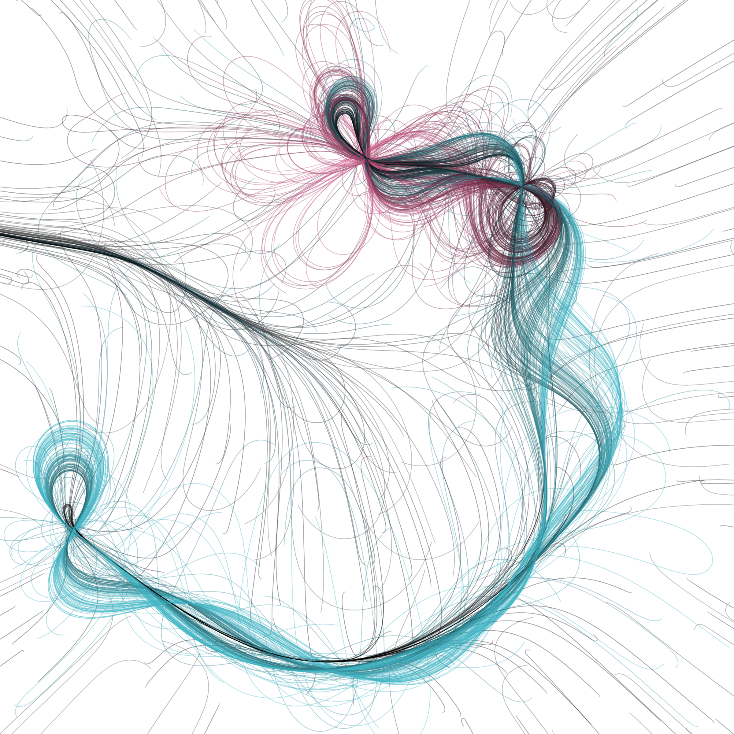 “Phototaxis” is a simulated environment populated by simple machines. After Valentino Braitenberg’s 1984 book “Vehicles,” there are four kinds of machines with different wiring and behaviors: Explorers, Aggressors, Lovers, and Cowards. Each line charts the history of one machine’s movement. The core of this code was the foundation for my MicroImage series of works dating back to 2001. I’ve worked on it in fits and starts since then, and in 2021 it was further developed for Art Blocks. Press ‘P’ to play/pause, ‘B’ for the big bang, ‘1’–’5’ to change the magnification, and ‘L’ to reveal the lights’ locations.