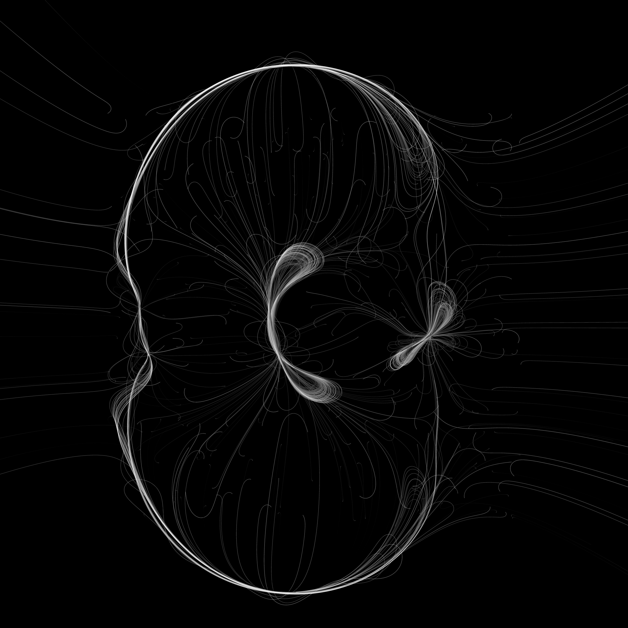 “Phototaxis” is a simulated environment populated by simple machines. After Valentino Braitenberg’s 1984 book “Vehicles,” there are four kinds of machines with different wiring and behaviors: Explorers, Aggressors, Lovers, and Cowards. Each line charts the history of one machine’s movement. The core of this code was the foundation for my MicroImage series of works dating back to 2001. I’ve worked on it in fits and starts since then, and in 2021 it was further developed for Art Blocks. Press ‘P’ to play/pause, ‘B’ for the big bang, ‘1’–’5’ to change the magnification, and ‘L’ to reveal the lights’ locations.