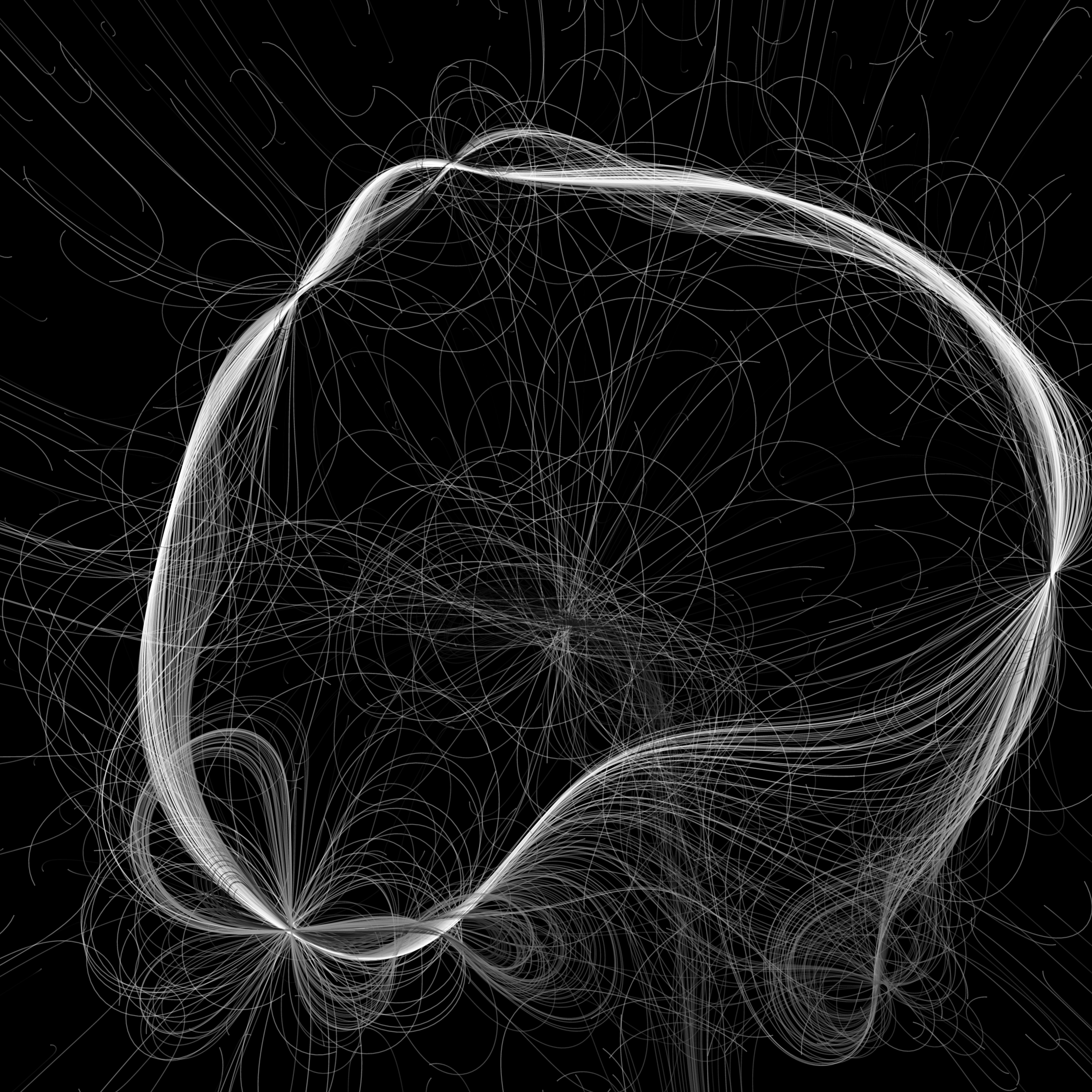 “Phototaxis” is a simulated environment populated by simple machines. After Valentino Braitenberg’s 1984 book “Vehicles,” there are four kinds of machines with different wiring and behaviors: Explorers, Aggressors, Lovers, and Cowards. Each line charts the history of one machine’s movement. The core of this code was the foundation for my MicroImage series of works dating back to 2001. I’ve worked on it in fits and starts since then, and in 2021 it was further developed for Art Blocks. Press ‘P’ to play/pause, ‘B’ for the big bang, ‘1’–’5’ to change the magnification, and ‘L’ to reveal the lights’ locations.