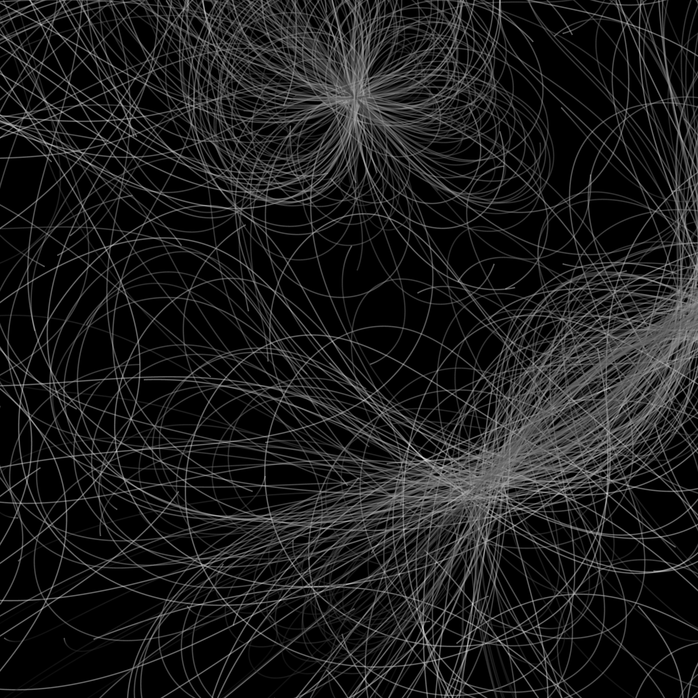 “Phototaxis” is a simulated environment populated by simple machines. After Valentino Braitenberg’s 1984 book “Vehicles,” there are four kinds of machines with different wiring and behaviors: Explorers, Aggressors, Lovers, and Cowards. Each line charts the history of one machine’s movement. The core of this code was the foundation for my MicroImage series of works dating back to 2001. I’ve worked on it in fits and starts since then, and in 2021 it was further developed for Art Blocks. Press ‘P’ to play/pause, ‘B’ for the big bang, ‘1’–’5’ to change the magnification, and ‘L’ to reveal the lights’ locations.