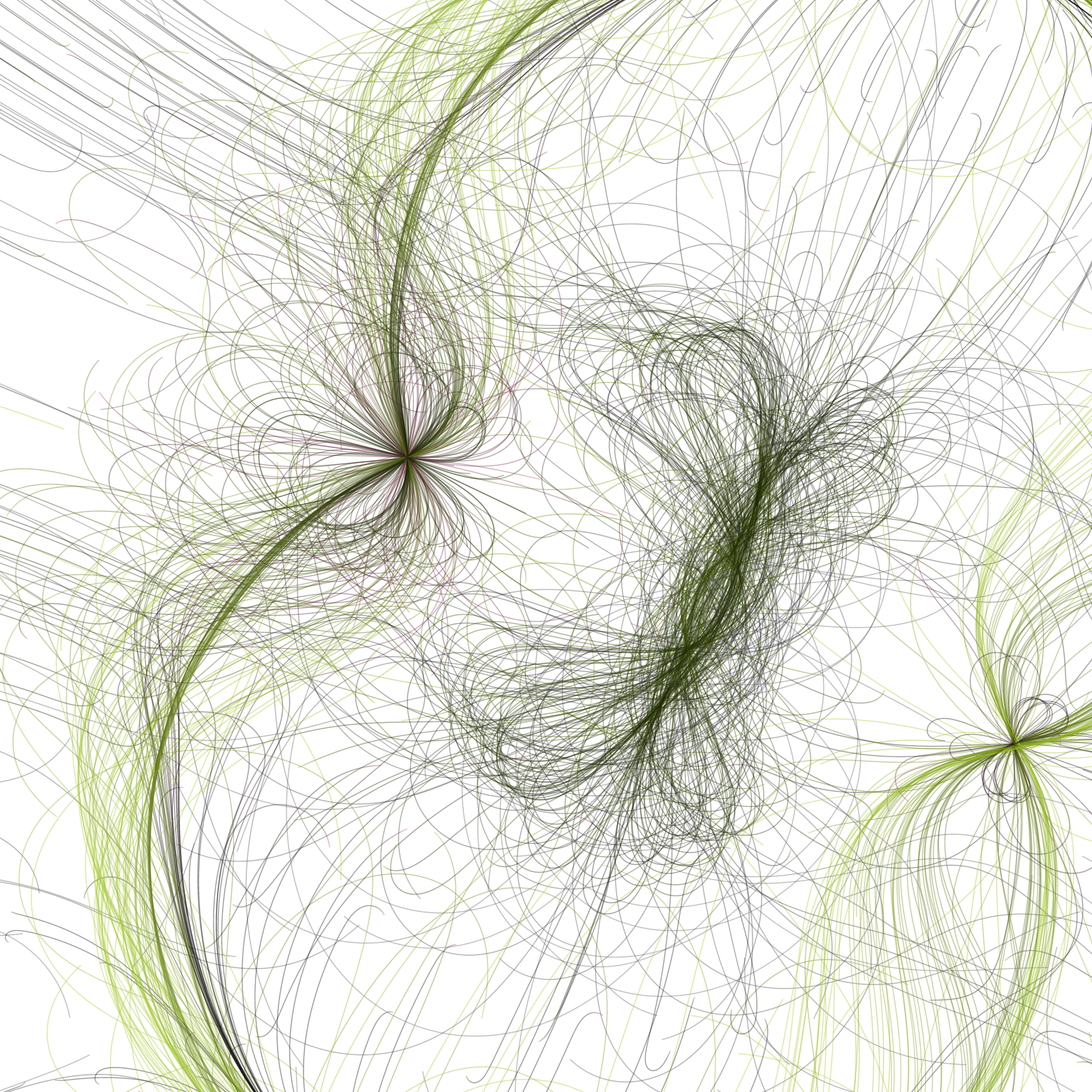“Phototaxis” is a simulated environment populated by simple machines. After Valentino Braitenberg’s 1984 book “Vehicles,” there are four kinds of machines with different wiring and behaviors: Explorers, Aggressors, Lovers, and Cowards. Each line charts the history of one machine’s movement. The core of this code was the foundation for my MicroImage series of works dating back to 2001. I’ve worked on it in fits and starts since then, and in 2021 it was further developed for Art Blocks. Press ‘P’ to play/pause, ‘B’ for the big bang, ‘1’–’5’ to change the magnification, and ‘L’ to reveal the lights’ locations.