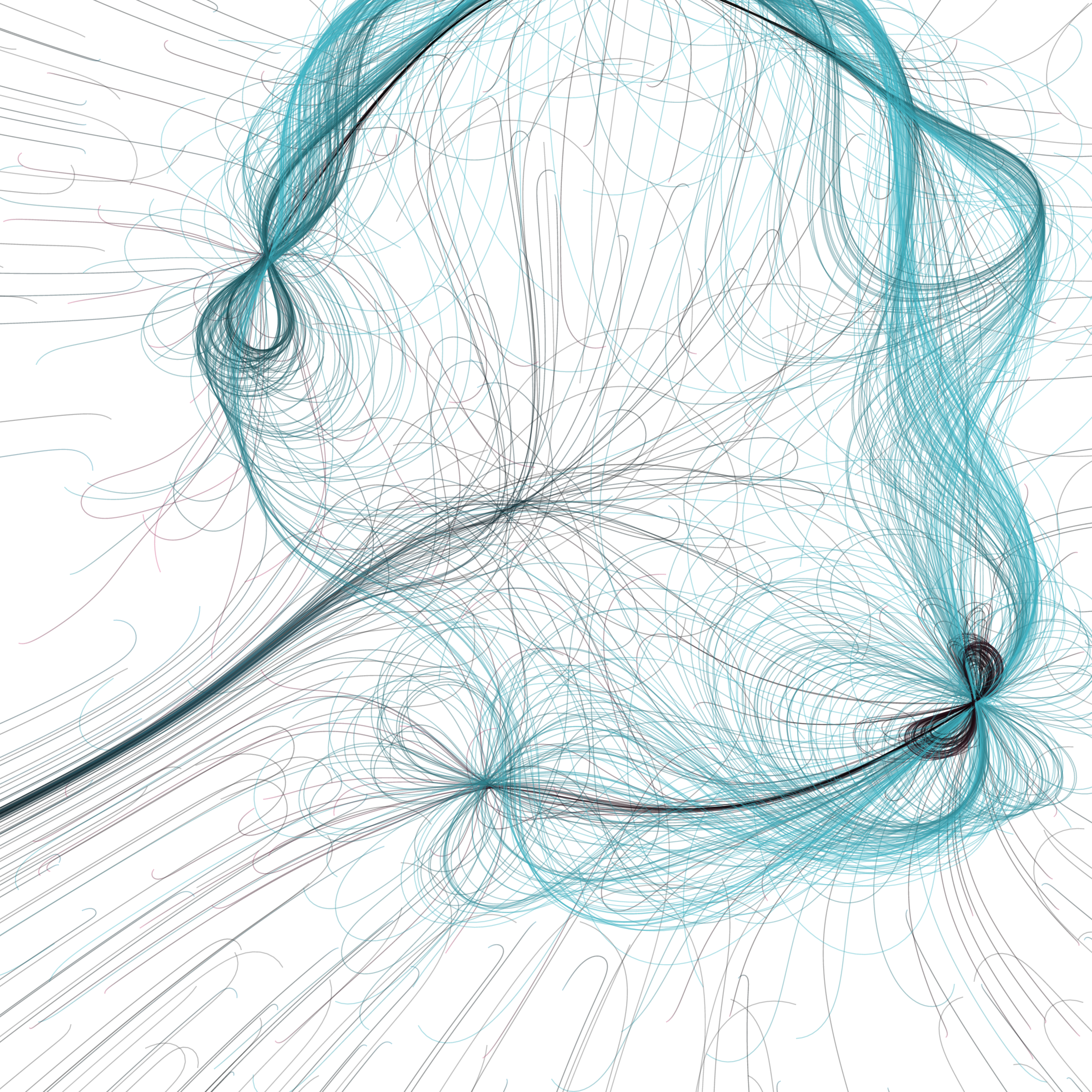 “Phototaxis” is a simulated environment populated by simple machines. After Valentino Braitenberg’s 1984 book “Vehicles,” there are four kinds of machines with different wiring and behaviors: Explorers, Aggressors, Lovers, and Cowards. Each line charts the history of one machine’s movement. The core of this code was the foundation for my MicroImage series of works dating back to 2001. I’ve worked on it in fits and starts since then, and in 2021 it was further developed for Art Blocks. Press ‘P’ to play/pause, ‘B’ for the big bang, ‘1’–’5’ to change the magnification, and ‘L’ to reveal the lights’ locations.