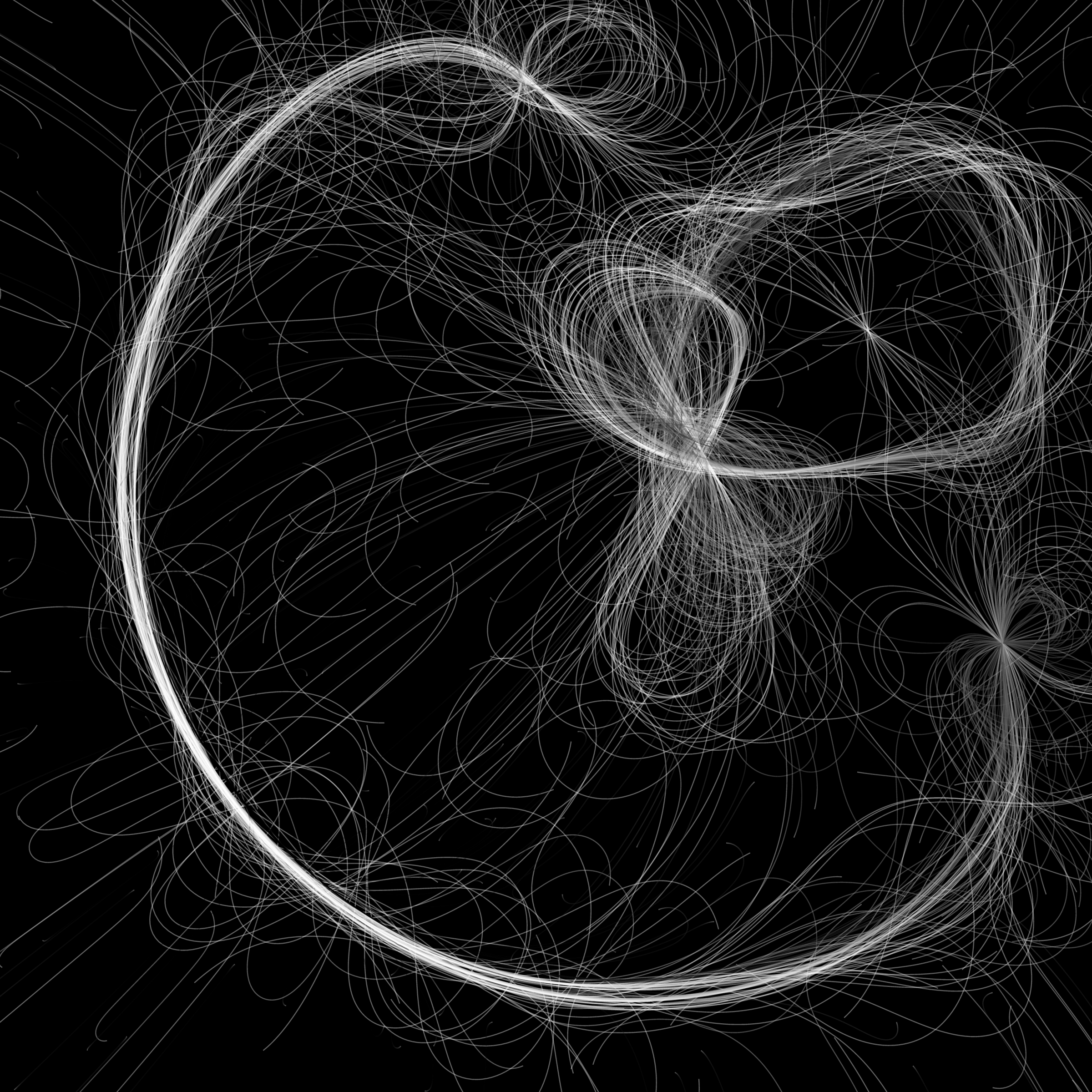 “Phototaxis” is a simulated environment populated by simple machines. After Valentino Braitenberg’s 1984 book “Vehicles,” there are four kinds of machines with different wiring and behaviors: Explorers, Aggressors, Lovers, and Cowards. Each line charts the history of one machine’s movement. The core of this code was the foundation for my MicroImage series of works dating back to 2001. I’ve worked on it in fits and starts since then, and in 2021 it was further developed for Art Blocks. Press ‘P’ to play/pause, ‘B’ for the big bang, ‘1’–’5’ to change the magnification, and ‘L’ to reveal the lights’ locations.