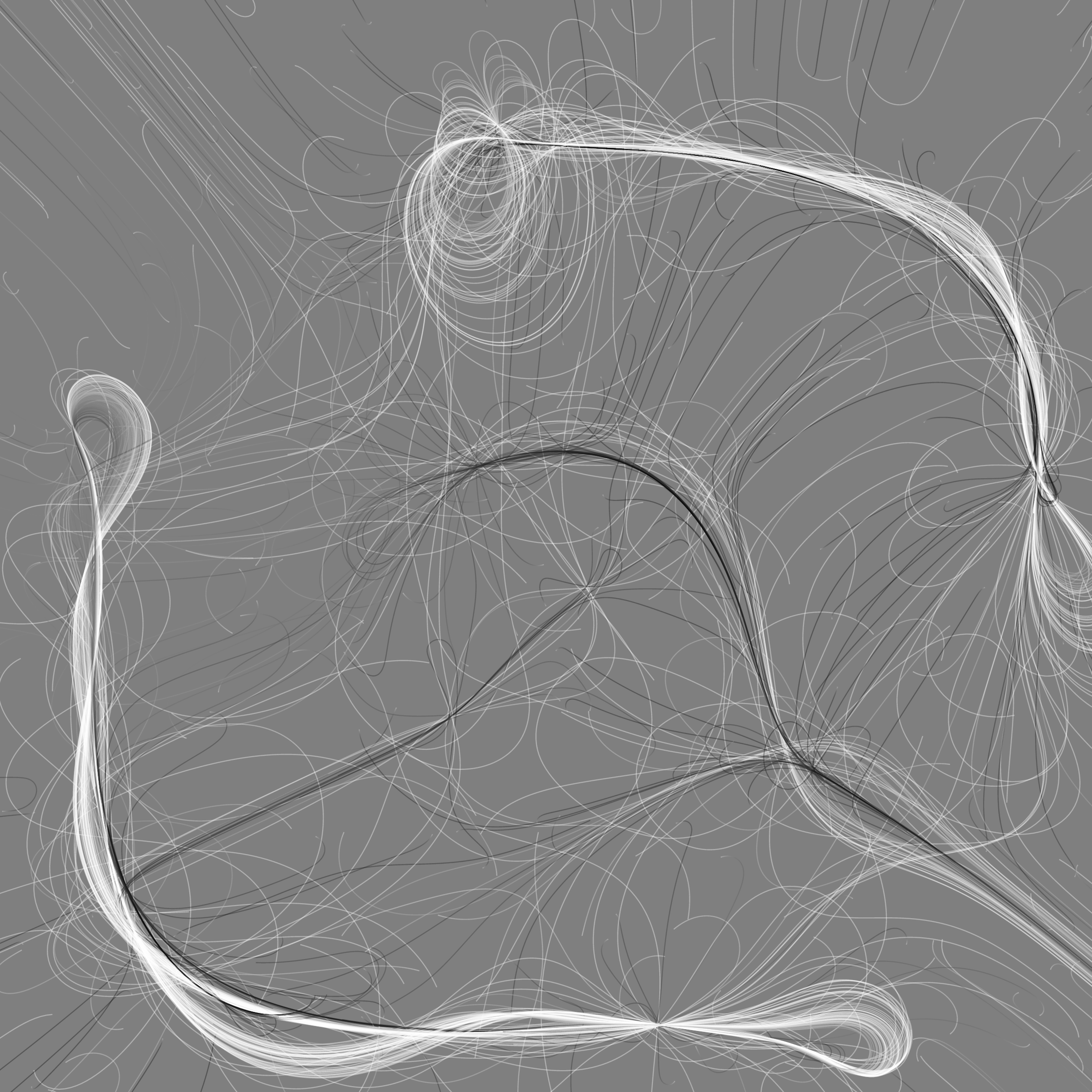“Phototaxis” is a simulated environment populated by simple machines. After Valentino Braitenberg’s 1984 book “Vehicles,” there are four kinds of machines with different wiring and behaviors: Explorers, Aggressors, Lovers, and Cowards. Each line charts the history of one machine’s movement. The core of this code was the foundation for my MicroImage series of works dating back to 2001. I’ve worked on it in fits and starts since then, and in 2021 it was further developed for Art Blocks. Press ‘P’ to play/pause, ‘B’ for the big bang, ‘1’–’5’ to change the magnification, and ‘L’ to reveal the lights’ locations.