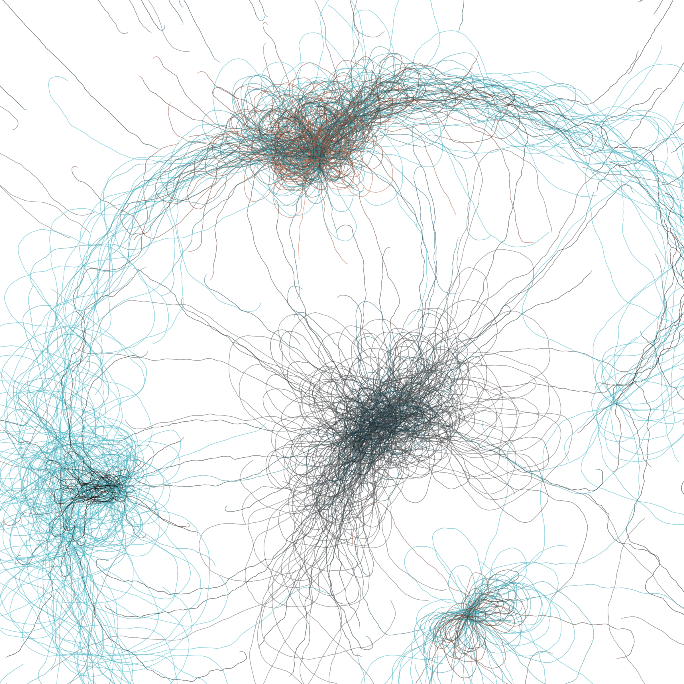 “Phototaxis” is a simulated environment populated by simple machines. After Valentino Braitenberg’s 1984 book “Vehicles,” there are four kinds of machines with different wiring and behaviors: Explorers, Aggressors, Lovers, and Cowards. Each line charts the history of one machine’s movement. The core of this code was the foundation for my MicroImage series of works dating back to 2001. I’ve worked on it in fits and starts since then, and in 2021 it was further developed for Art Blocks. Press ‘P’ to play/pause, ‘B’ for the big bang, ‘1’–’5’ to change the magnification, and ‘L’ to reveal the lights’ locations.