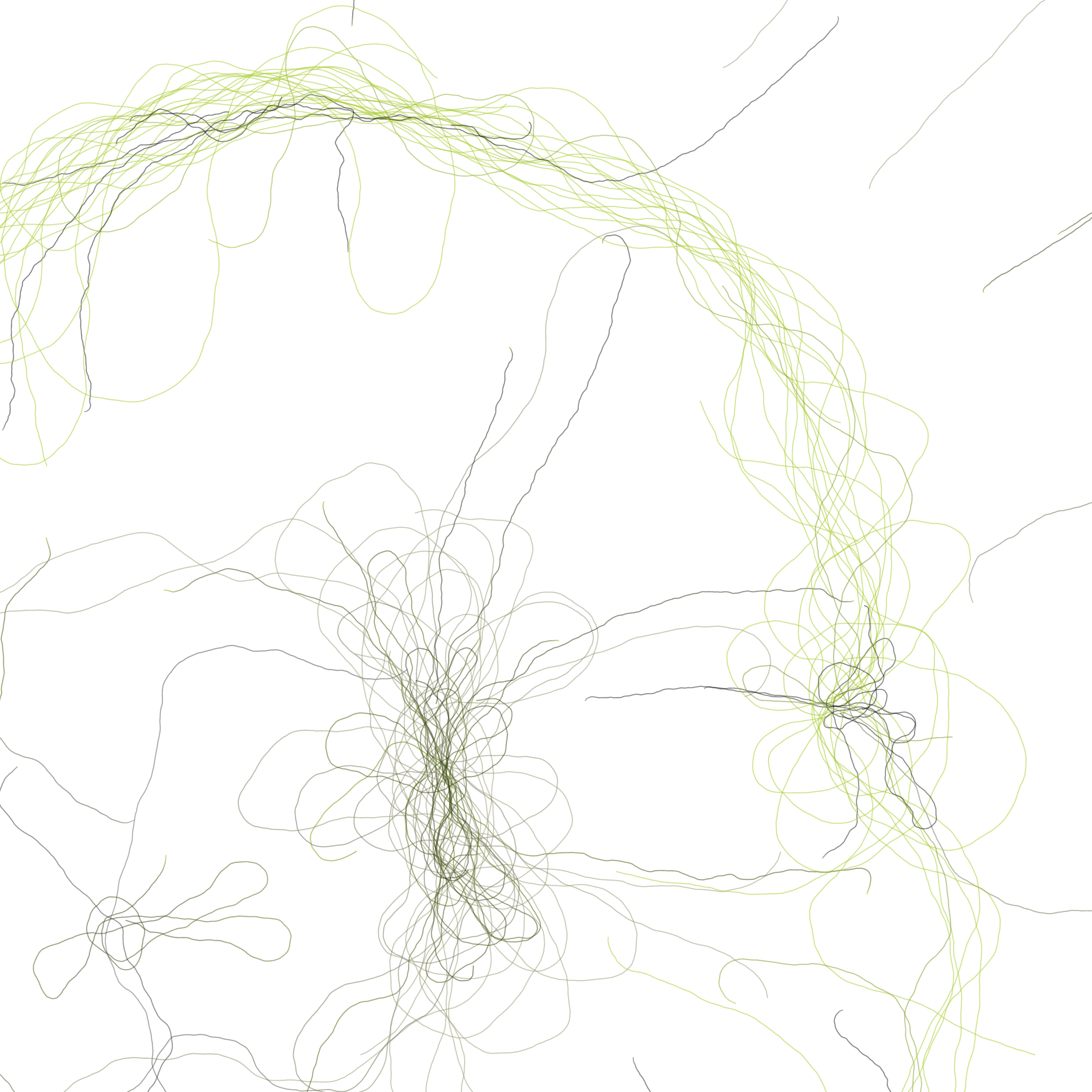 “Phototaxis” is a simulated environment populated by simple machines. After Valentino Braitenberg’s 1984 book “Vehicles,” there are four kinds of machines with different wiring and behaviors: Explorers, Aggressors, Lovers, and Cowards. Each line charts the history of one machine’s movement. The core of this code was the foundation for my MicroImage series of works dating back to 2001. I’ve worked on it in fits and starts since then, and in 2021 it was further developed for Art Blocks. Press ‘P’ to play/pause, ‘B’ for the big bang, ‘1’–’5’ to change the magnification, and ‘L’ to reveal the lights’ locations.