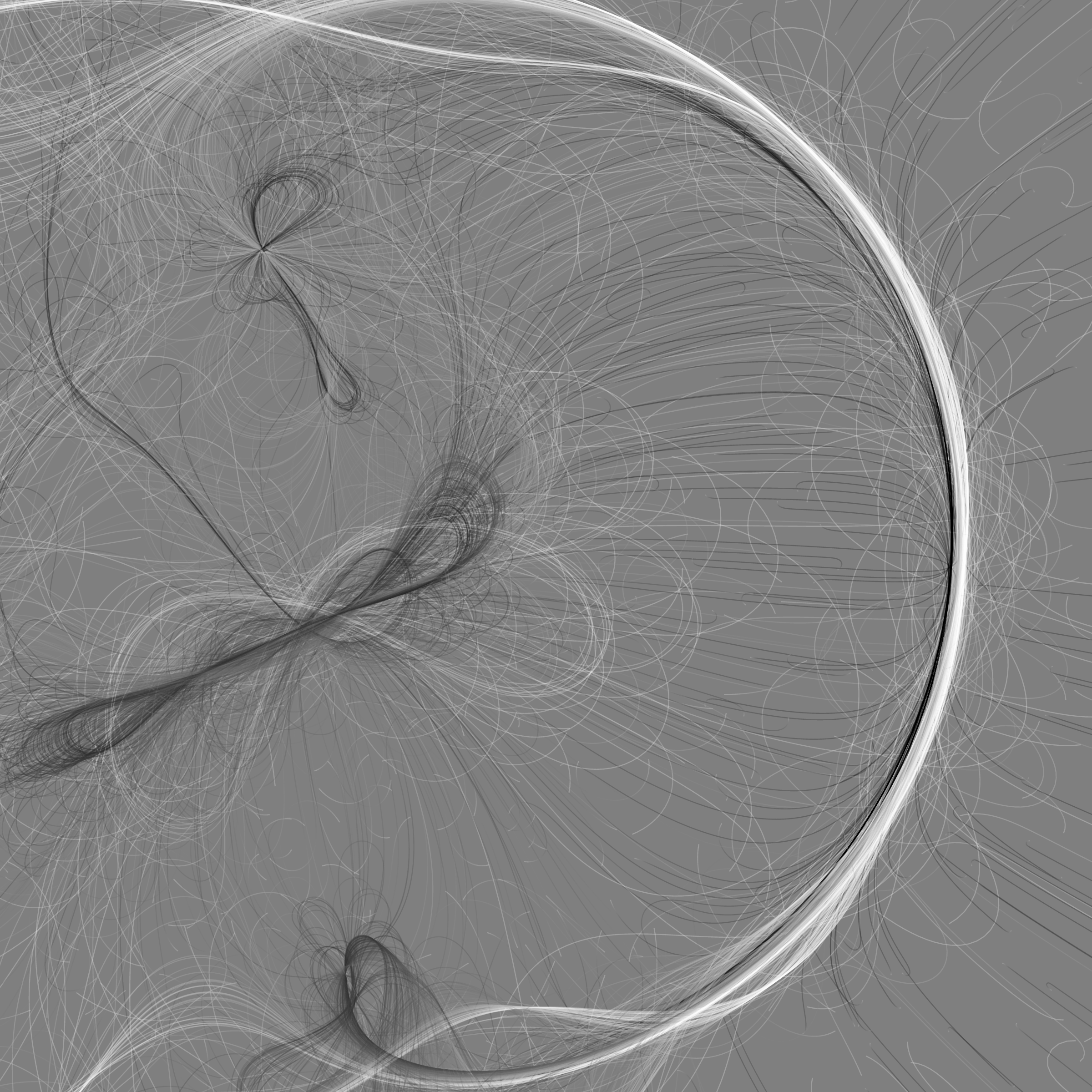 “Phototaxis” is a simulated environment populated by simple machines. After Valentino Braitenberg’s 1984 book “Vehicles,” there are four kinds of machines with different wiring and behaviors: Explorers, Aggressors, Lovers, and Cowards. Each line charts the history of one machine’s movement. The core of this code was the foundation for my MicroImage series of works dating back to 2001. I’ve worked on it in fits and starts since then, and in 2021 it was further developed for Art Blocks. Press ‘P’ to play/pause, ‘B’ for the big bang, ‘1’–’5’ to change the magnification, and ‘L’ to reveal the lights’ locations.