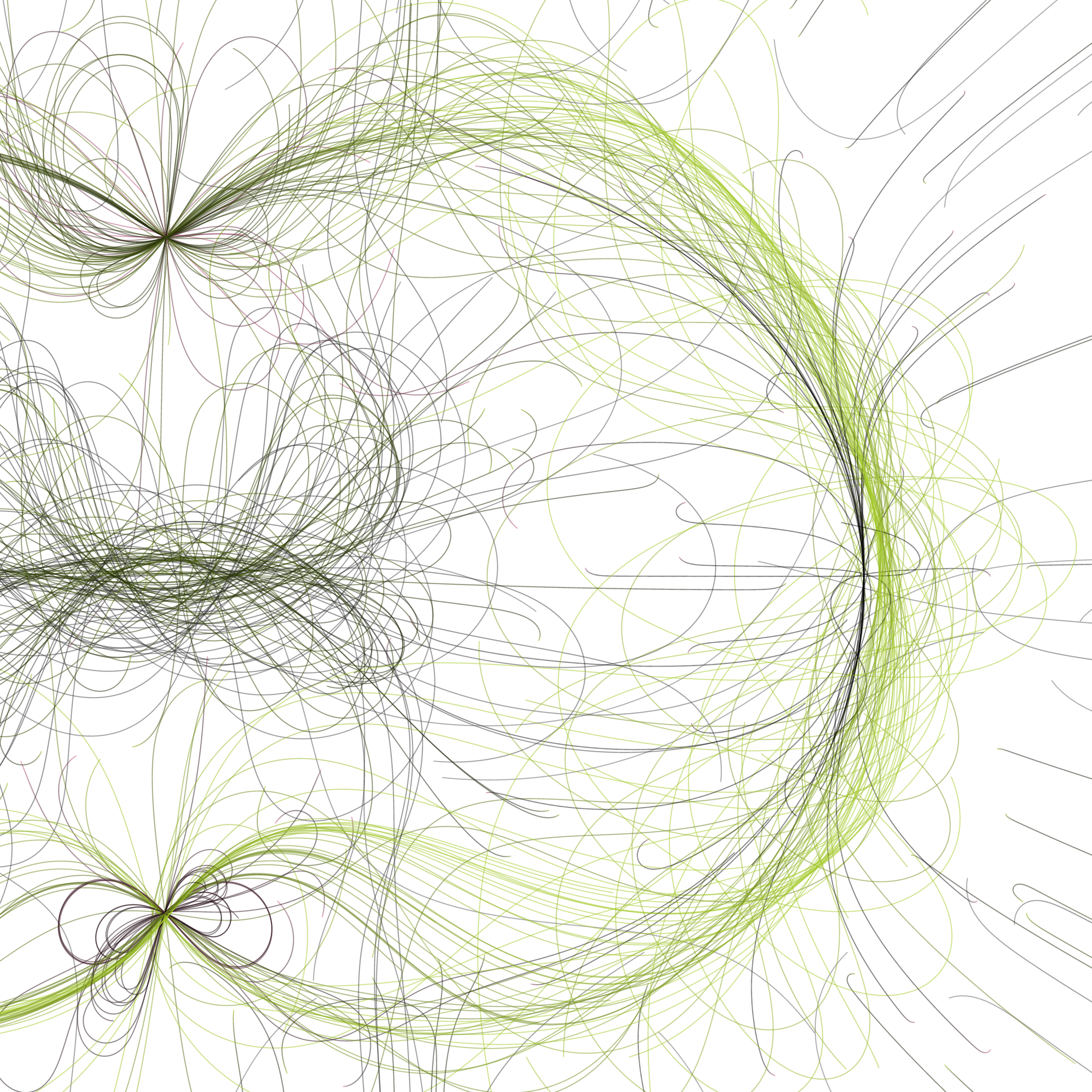 “Phototaxis” is a simulated environment populated by simple machines. After Valentino Braitenberg’s 1984 book “Vehicles,” there are four kinds of machines with different wiring and behaviors: Explorers, Aggressors, Lovers, and Cowards. Each line charts the history of one machine’s movement. The core of this code was the foundation for my MicroImage series of works dating back to 2001. I’ve worked on it in fits and starts since then, and in 2021 it was further developed for Art Blocks. Press ‘P’ to play/pause, ‘B’ for the big bang, ‘1’–’5’ to change the magnification, and ‘L’ to reveal the lights’ locations.