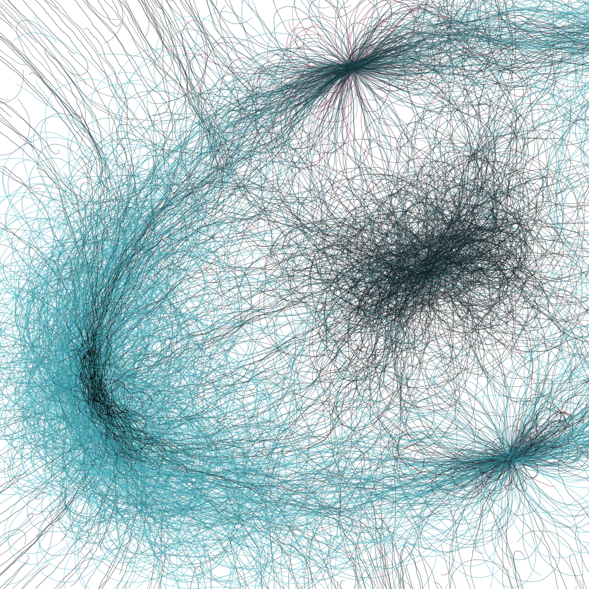 “Phototaxis” is a simulated environment populated by simple machines. After Valentino Braitenberg’s 1984 book “Vehicles,” there are four kinds of machines with different wiring and behaviors: Explorers, Aggressors, Lovers, and Cowards. Each line charts the history of one machine’s movement. The core of this code was the foundation for my MicroImage series of works dating back to 2001. I’ve worked on it in fits and starts since then, and in 2021 it was further developed for Art Blocks. Press ‘P’ to play/pause, ‘B’ for the big bang, ‘1’–’5’ to change the magnification, and ‘L’ to reveal the lights’ locations.