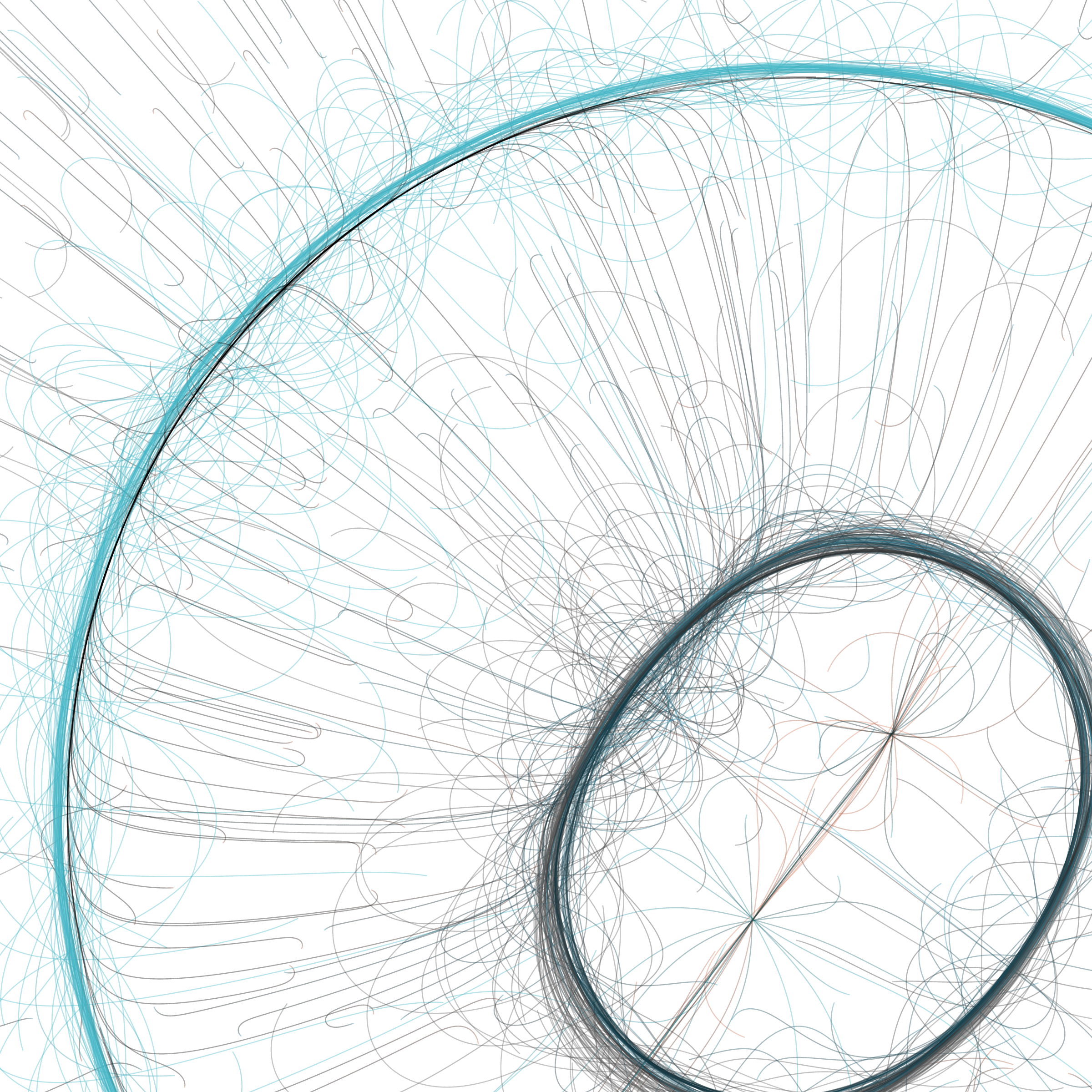 “Phototaxis” is a simulated environment populated by simple machines. After Valentino Braitenberg’s 1984 book “Vehicles,” there are four kinds of machines with different wiring and behaviors: Explorers, Aggressors, Lovers, and Cowards. Each line charts the history of one machine’s movement. The core of this code was the foundation for my MicroImage series of works dating back to 2001. I’ve worked on it in fits and starts since then, and in 2021 it was further developed for Art Blocks. Press ‘P’ to play/pause, ‘B’ for the big bang, ‘1’–’5’ to change the magnification, and ‘L’ to reveal the lights’ locations.