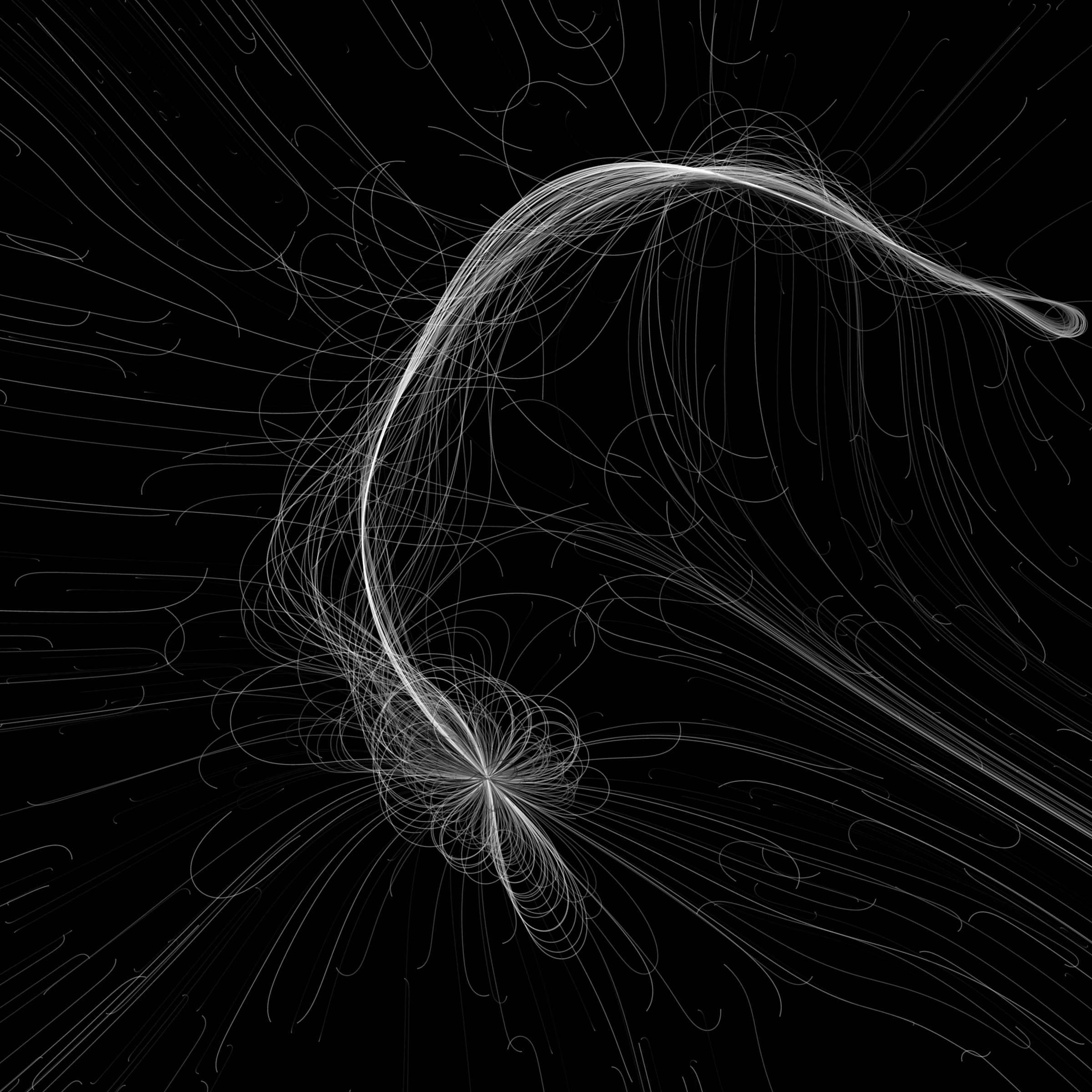 “Phototaxis” is a simulated environment populated by simple machines. After Valentino Braitenberg’s 1984 book “Vehicles,” there are four kinds of machines with different wiring and behaviors: Explorers, Aggressors, Lovers, and Cowards. Each line charts the history of one machine’s movement. The core of this code was the foundation for my MicroImage series of works dating back to 2001. I’ve worked on it in fits and starts since then, and in 2021 it was further developed for Art Blocks. Press ‘P’ to play/pause, ‘B’ for the big bang, ‘1’–’5’ to change the magnification, and ‘L’ to reveal the lights’ locations.