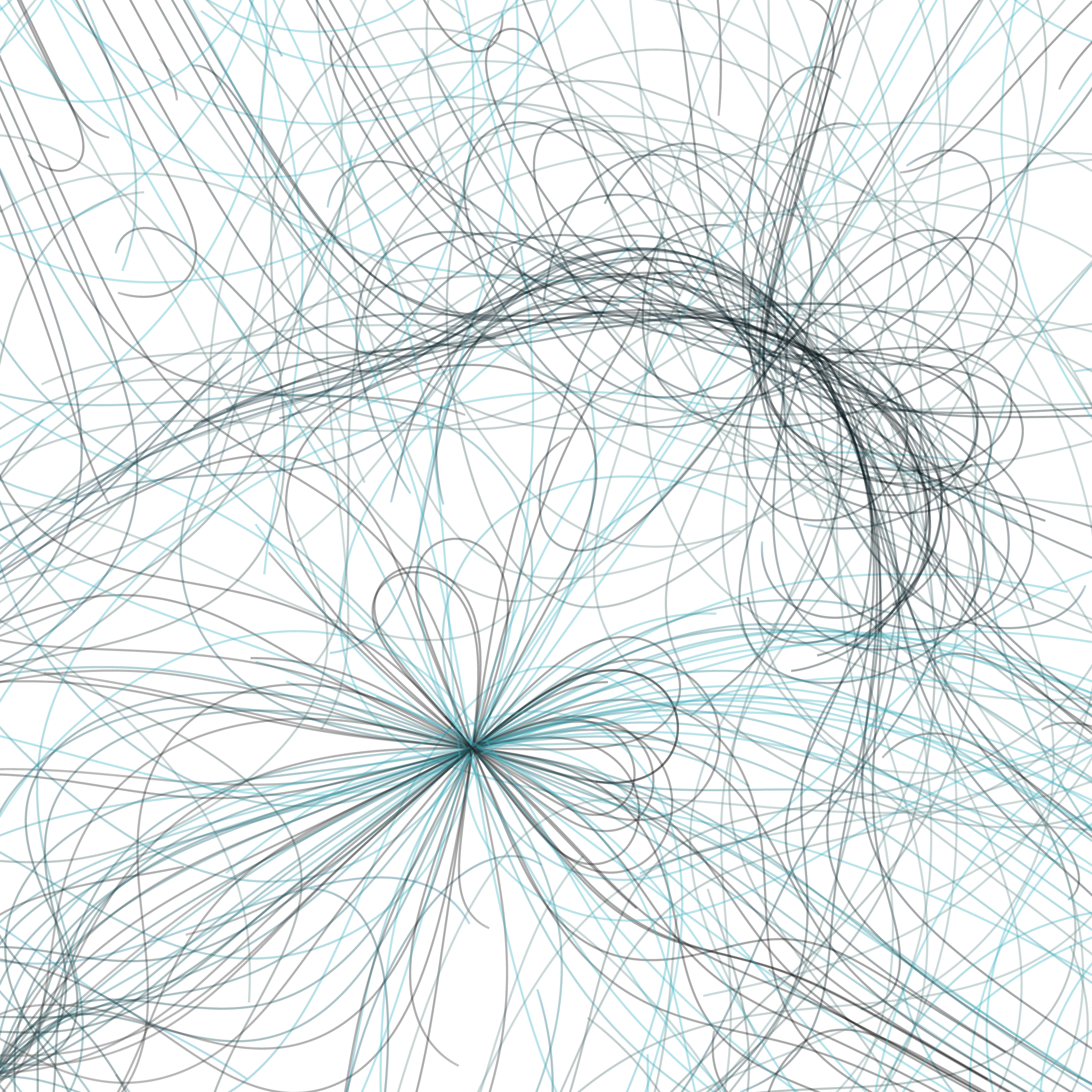 “Phototaxis” is a simulated environment populated by simple machines. After Valentino Braitenberg’s 1984 book “Vehicles,” there are four kinds of machines with different wiring and behaviors: Explorers, Aggressors, Lovers, and Cowards. Each line charts the history of one machine’s movement. The core of this code was the foundation for my MicroImage series of works dating back to 2001. I’ve worked on it in fits and starts since then, and in 2021 it was further developed for Art Blocks. Press ‘P’ to play/pause, ‘B’ for the big bang, ‘1’–’5’ to change the magnification, and ‘L’ to reveal the lights’ locations.