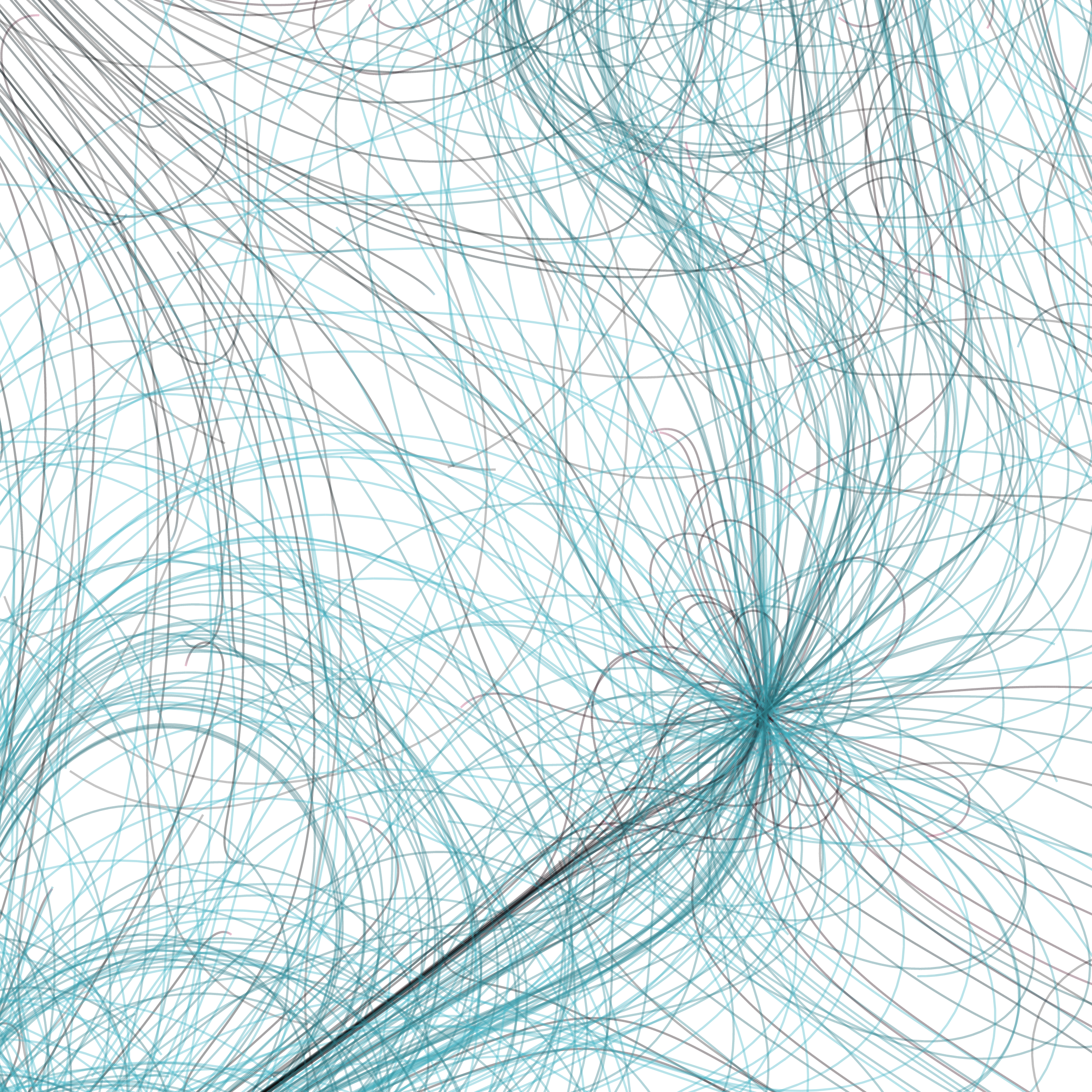 “Phototaxis” is a simulated environment populated by simple machines. After Valentino Braitenberg’s 1984 book “Vehicles,” there are four kinds of machines with different wiring and behaviors: Explorers, Aggressors, Lovers, and Cowards. Each line charts the history of one machine’s movement. The core of this code was the foundation for my MicroImage series of works dating back to 2001. I’ve worked on it in fits and starts since then, and in 2021 it was further developed for Art Blocks. Press ‘P’ to play/pause, ‘B’ for the big bang, ‘1’–’5’ to change the magnification, and ‘L’ to reveal the lights’ locations.