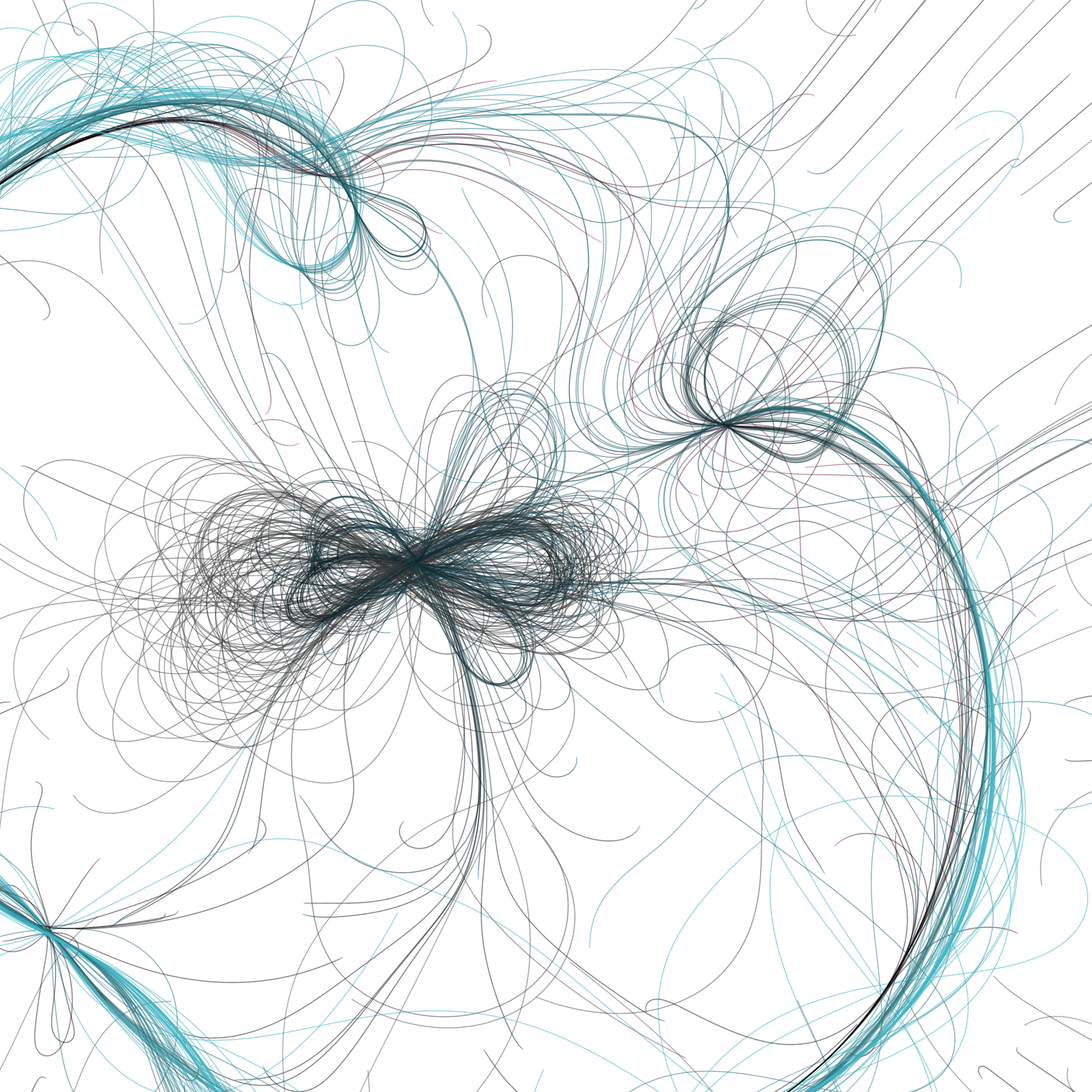 “Phototaxis” is a simulated environment populated by simple machines. After Valentino Braitenberg’s 1984 book “Vehicles,” there are four kinds of machines with different wiring and behaviors: Explorers, Aggressors, Lovers, and Cowards. Each line charts the history of one machine’s movement. The core of this code was the foundation for my MicroImage series of works dating back to 2001. I’ve worked on it in fits and starts since then, and in 2021 it was further developed for Art Blocks. Press ‘P’ to play/pause, ‘B’ for the big bang, ‘1’–’5’ to change the magnification, and ‘L’ to reveal the lights’ locations.
