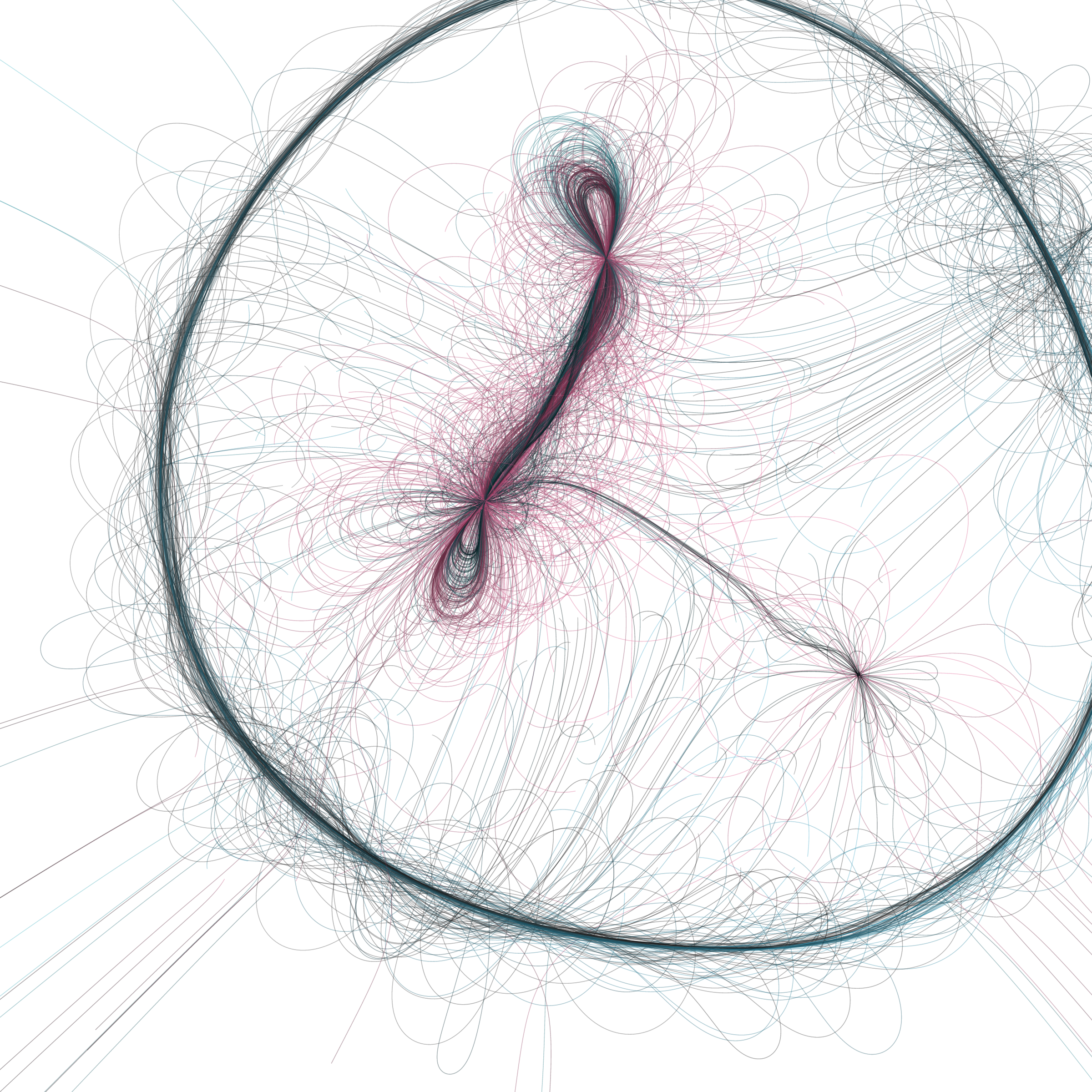 “Phototaxis” is a simulated environment populated by simple machines. After Valentino Braitenberg’s 1984 book “Vehicles,” there are four kinds of machines with different wiring and behaviors: Explorers, Aggressors, Lovers, and Cowards. Each line charts the history of one machine’s movement. The core of this code was the foundation for my MicroImage series of works dating back to 2001. I’ve worked on it in fits and starts since then, and in 2021 it was further developed for Art Blocks. Press ‘P’ to play/pause, ‘B’ for the big bang, ‘1’–’5’ to change the magnification, and ‘L’ to reveal the lights’ locations.