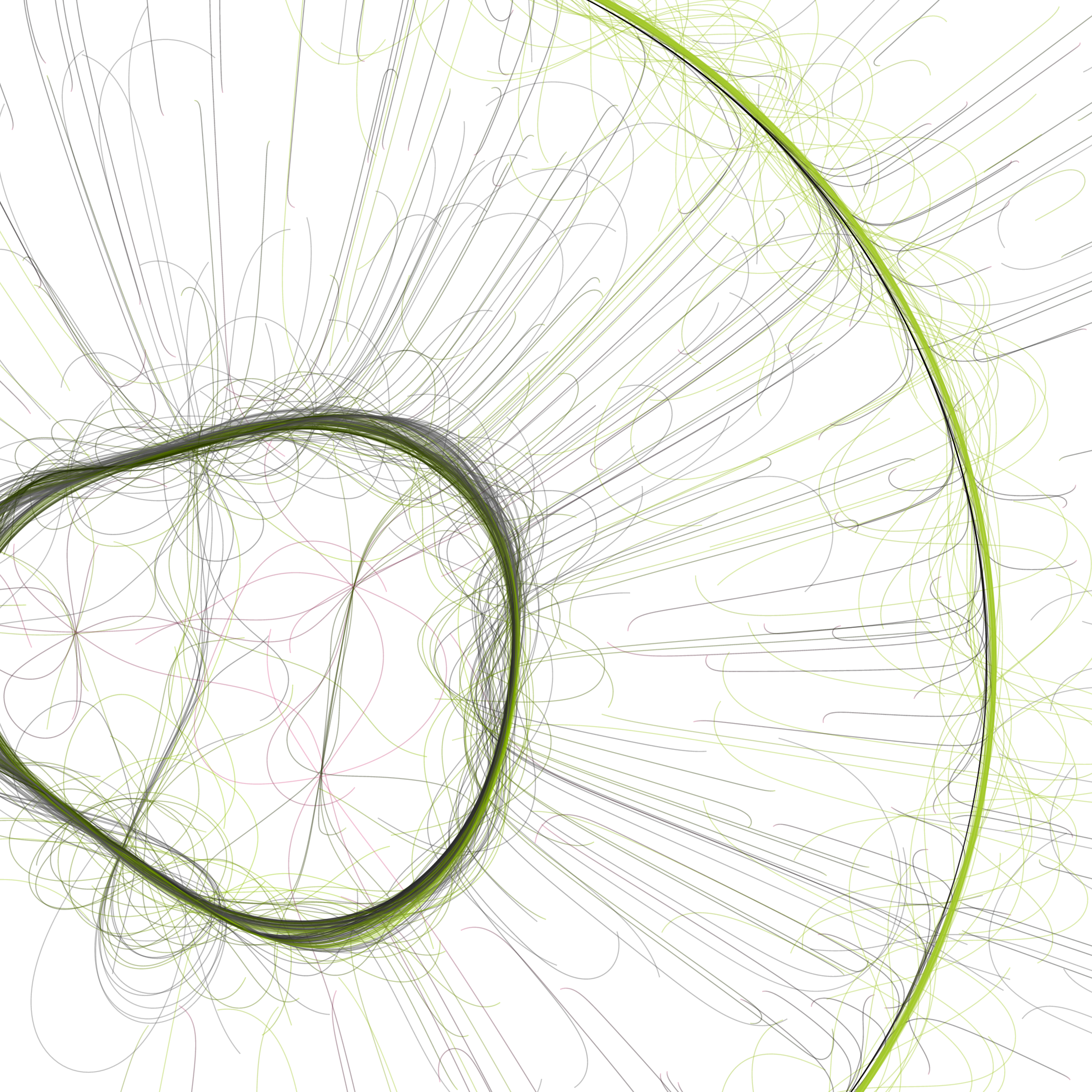 “Phototaxis” is a simulated environment populated by simple machines. After Valentino Braitenberg’s 1984 book “Vehicles,” there are four kinds of machines with different wiring and behaviors: Explorers, Aggressors, Lovers, and Cowards. Each line charts the history of one machine’s movement. The core of this code was the foundation for my MicroImage series of works dating back to 2001. I’ve worked on it in fits and starts since then, and in 2021 it was further developed for Art Blocks. Press ‘P’ to play/pause, ‘B’ for the big bang, ‘1’–’5’ to change the magnification, and ‘L’ to reveal the lights’ locations.