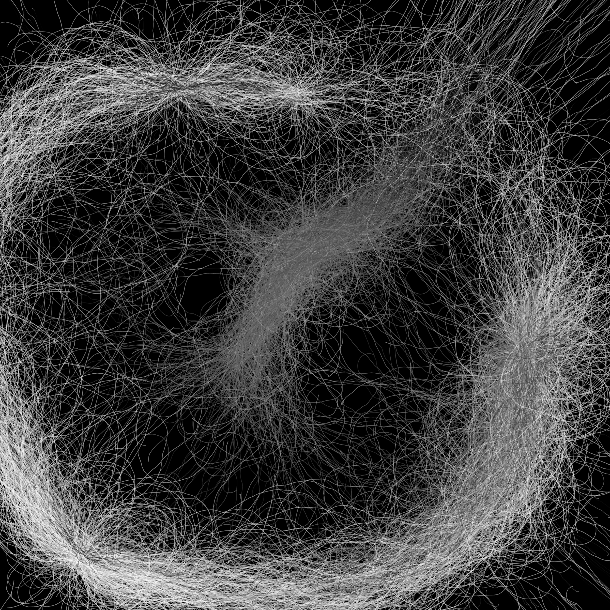 “Phototaxis” is a simulated environment populated by simple machines. After Valentino Braitenberg’s 1984 book “Vehicles,” there are four kinds of machines with different wiring and behaviors: Explorers, Aggressors, Lovers, and Cowards. Each line charts the history of one machine’s movement. The core of this code was the foundation for my MicroImage series of works dating back to 2001. I’ve worked on it in fits and starts since then, and in 2021 it was further developed for Art Blocks. Press ‘P’ to play/pause, ‘B’ for the big bang, ‘1’–’5’ to change the magnification, and ‘L’ to reveal the lights’ locations.