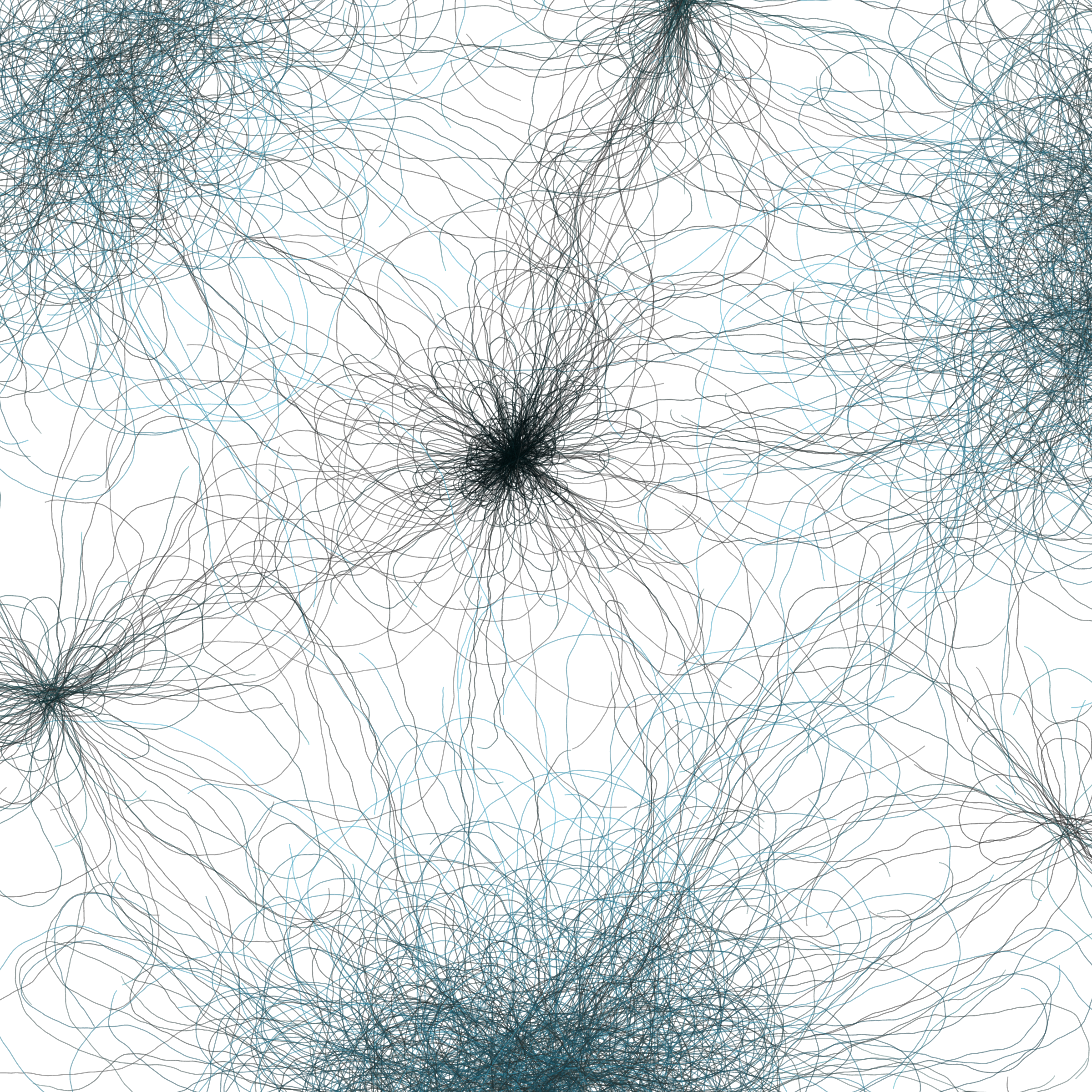 “Phototaxis” is a simulated environment populated by simple machines. After Valentino Braitenberg’s 1984 book “Vehicles,” there are four kinds of machines with different wiring and behaviors: Explorers, Aggressors, Lovers, and Cowards. Each line charts the history of one machine’s movement. The core of this code was the foundation for my MicroImage series of works dating back to 2001. I’ve worked on it in fits and starts since then, and in 2021 it was further developed for Art Blocks. Press ‘P’ to play/pause, ‘B’ for the big bang, ‘1’–’5’ to change the magnification, and ‘L’ to reveal the lights’ locations.