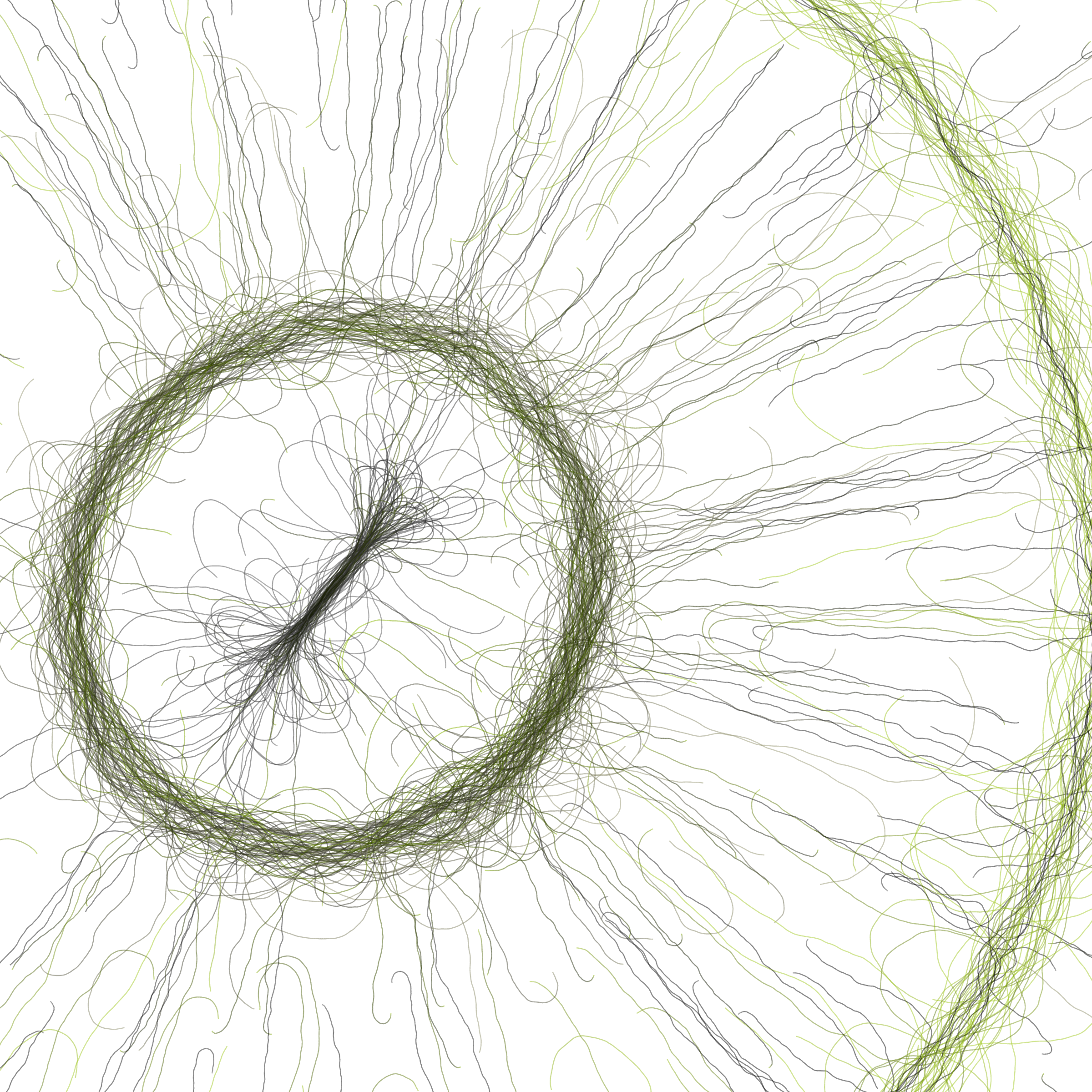 “Phototaxis” is a simulated environment populated by simple machines. After Valentino Braitenberg’s 1984 book “Vehicles,” there are four kinds of machines with different wiring and behaviors: Explorers, Aggressors, Lovers, and Cowards. Each line charts the history of one machine’s movement. The core of this code was the foundation for my MicroImage series of works dating back to 2001. I’ve worked on it in fits and starts since then, and in 2021 it was further developed for Art Blocks. Press ‘P’ to play/pause, ‘B’ for the big bang, ‘1’–’5’ to change the magnification, and ‘L’ to reveal the lights’ locations.