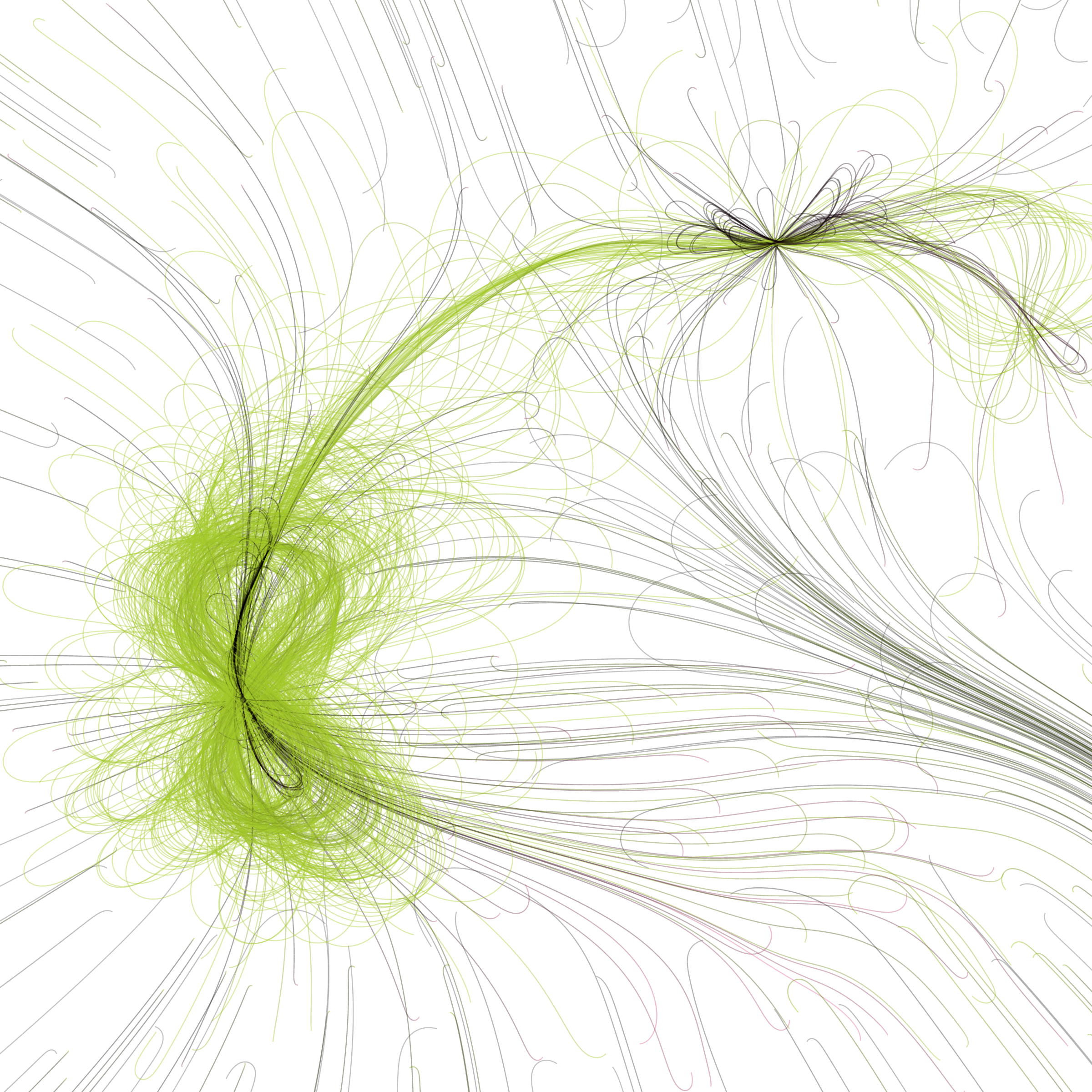 “Phototaxis” is a simulated environment populated by simple machines. After Valentino Braitenberg’s 1984 book “Vehicles,” there are four kinds of machines with different wiring and behaviors: Explorers, Aggressors, Lovers, and Cowards. Each line charts the history of one machine’s movement. The core of this code was the foundation for my MicroImage series of works dating back to 2001. I’ve worked on it in fits and starts since then, and in 2021 it was further developed for Art Blocks. Press ‘P’ to play/pause, ‘B’ for the big bang, ‘1’–’5’ to change the magnification, and ‘L’ to reveal the lights’ locations.