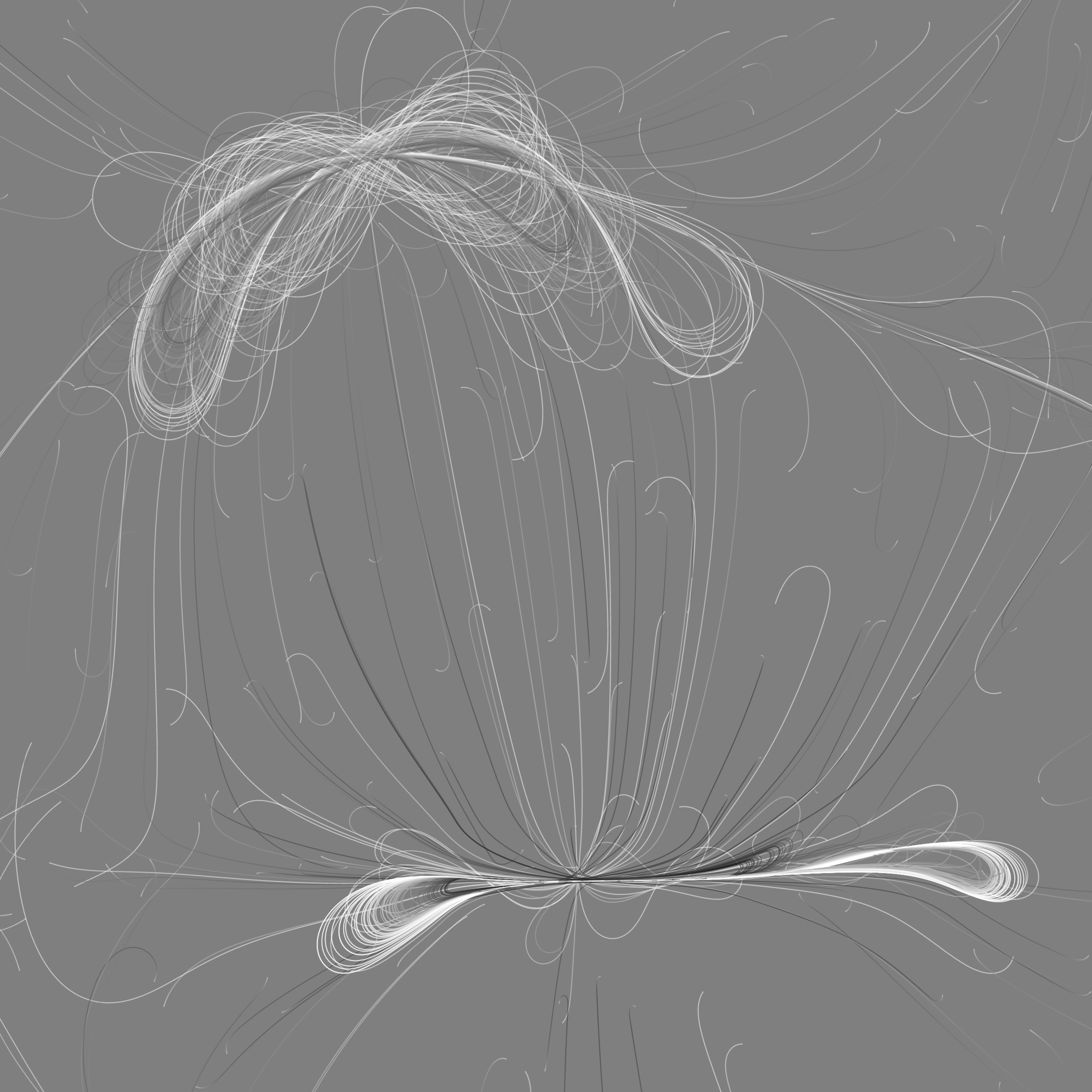 “Phototaxis” is a simulated environment populated by simple machines. After Valentino Braitenberg’s 1984 book “Vehicles,” there are four kinds of machines with different wiring and behaviors: Explorers, Aggressors, Lovers, and Cowards. Each line charts the history of one machine’s movement. The core of this code was the foundation for my MicroImage series of works dating back to 2001. I’ve worked on it in fits and starts since then, and in 2021 it was further developed for Art Blocks. Press ‘P’ to play/pause, ‘B’ for the big bang, ‘1’–’5’ to change the magnification, and ‘L’ to reveal the lights’ locations.