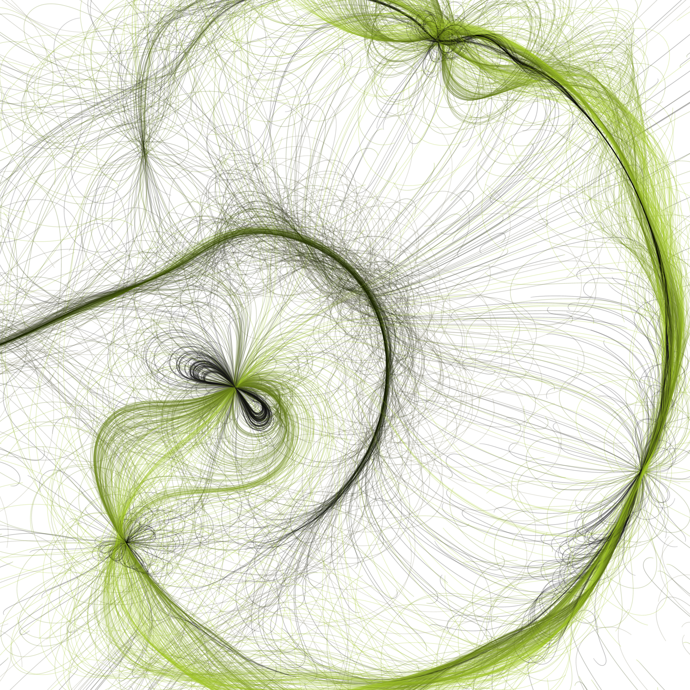 “Phototaxis” is a simulated environment populated by simple machines. After Valentino Braitenberg’s 1984 book “Vehicles,” there are four kinds of machines with different wiring and behaviors: Explorers, Aggressors, Lovers, and Cowards. Each line charts the history of one machine’s movement. The core of this code was the foundation for my MicroImage series of works dating back to 2001. I’ve worked on it in fits and starts since then, and in 2021 it was further developed for Art Blocks. Press ‘P’ to play/pause, ‘B’ for the big bang, ‘1’–’5’ to change the magnification, and ‘L’ to reveal the lights’ locations.