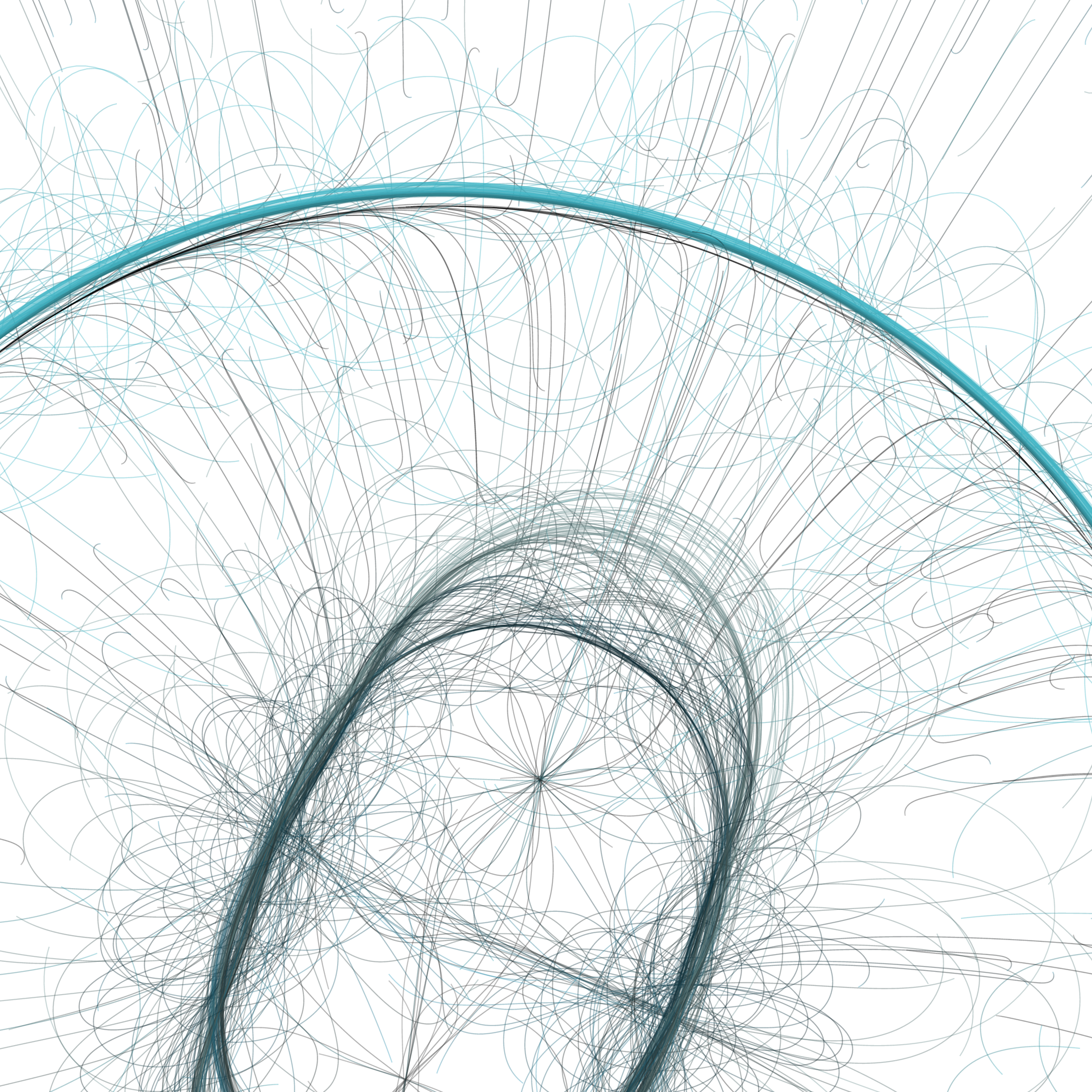 “Phototaxis” is a simulated environment populated by simple machines. After Valentino Braitenberg’s 1984 book “Vehicles,” there are four kinds of machines with different wiring and behaviors: Explorers, Aggressors, Lovers, and Cowards. Each line charts the history of one machine’s movement. The core of this code was the foundation for my MicroImage series of works dating back to 2001. I’ve worked on it in fits and starts since then, and in 2021 it was further developed for Art Blocks. Press ‘P’ to play/pause, ‘B’ for the big bang, ‘1’–’5’ to change the magnification, and ‘L’ to reveal the lights’ locations.
