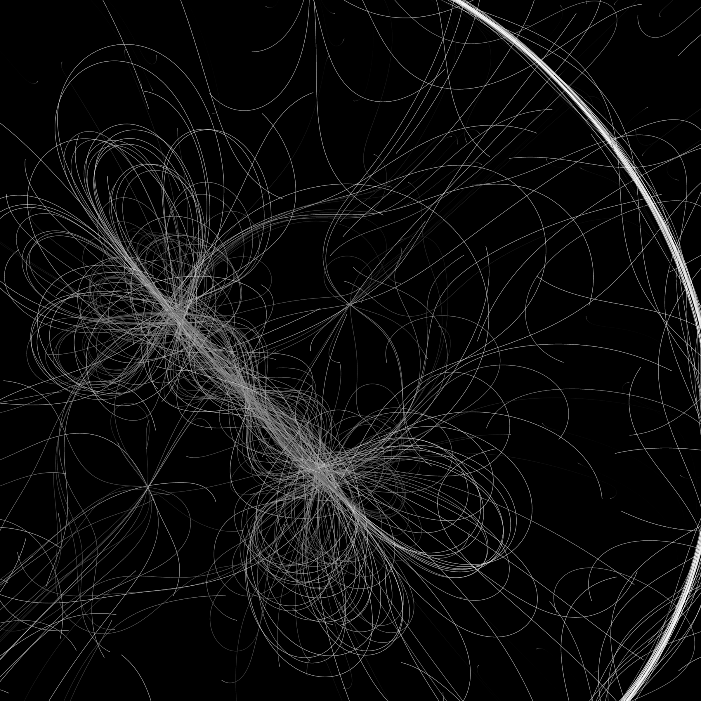 “Phototaxis” is a simulated environment populated by simple machines. After Valentino Braitenberg’s 1984 book “Vehicles,” there are four kinds of machines with different wiring and behaviors: Explorers, Aggressors, Lovers, and Cowards. Each line charts the history of one machine’s movement. The core of this code was the foundation for my MicroImage series of works dating back to 2001. I’ve worked on it in fits and starts since then, and in 2021 it was further developed for Art Blocks. Press ‘P’ to play/pause, ‘B’ for the big bang, ‘1’–’5’ to change the magnification, and ‘L’ to reveal the lights’ locations.
