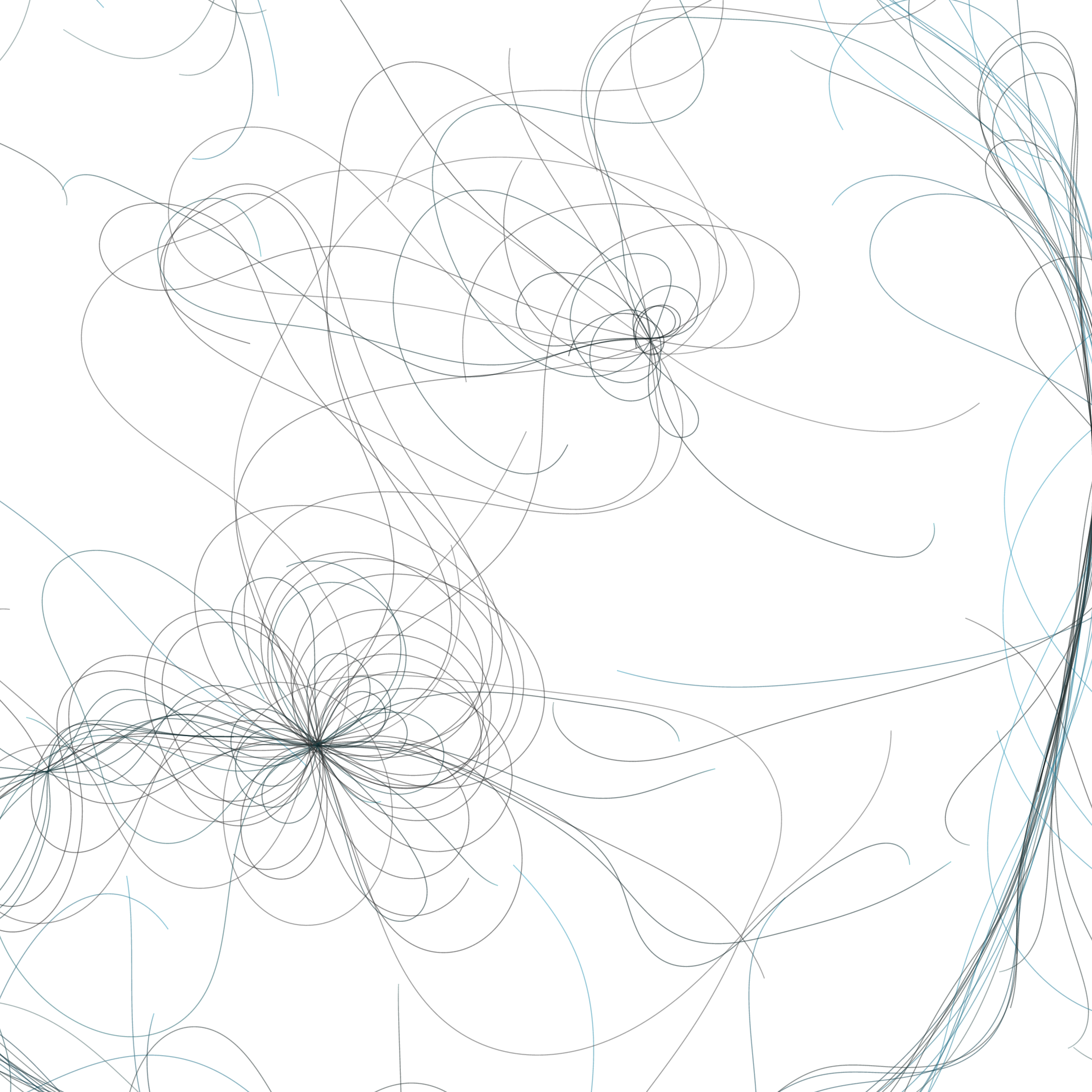 “Phototaxis” is a simulated environment populated by simple machines. After Valentino Braitenberg’s 1984 book “Vehicles,” there are four kinds of machines with different wiring and behaviors: Explorers, Aggressors, Lovers, and Cowards. Each line charts the history of one machine’s movement. The core of this code was the foundation for my MicroImage series of works dating back to 2001. I’ve worked on it in fits and starts since then, and in 2021 it was further developed for Art Blocks. Press ‘P’ to play/pause, ‘B’ for the big bang, ‘1’–’5’ to change the magnification, and ‘L’ to reveal the lights’ locations.
