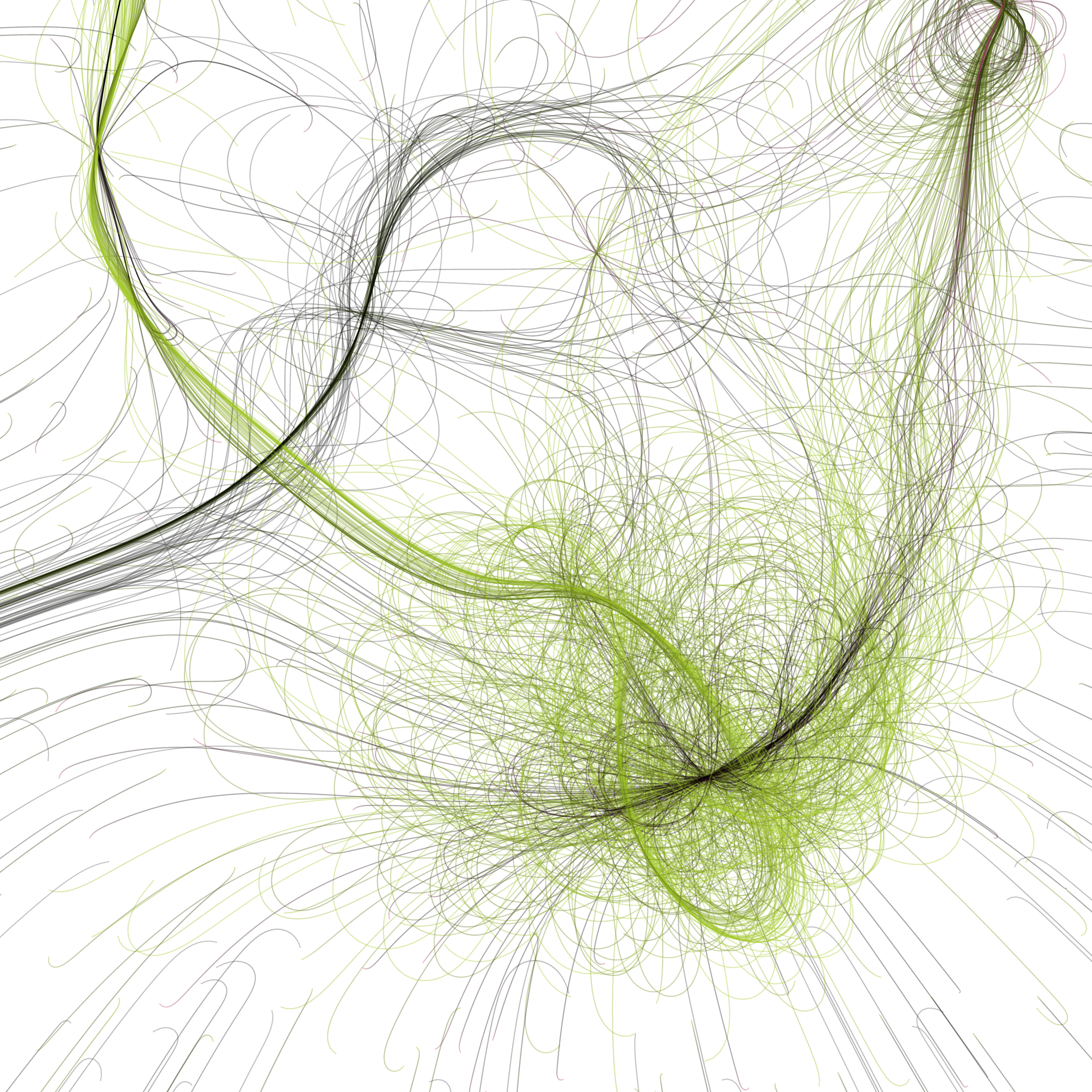 “Phototaxis” is a simulated environment populated by simple machines. After Valentino Braitenberg’s 1984 book “Vehicles,” there are four kinds of machines with different wiring and behaviors: Explorers, Aggressors, Lovers, and Cowards. Each line charts the history of one machine’s movement. The core of this code was the foundation for my MicroImage series of works dating back to 2001. I’ve worked on it in fits and starts since then, and in 2021 it was further developed for Art Blocks. Press ‘P’ to play/pause, ‘B’ for the big bang, ‘1’–’5’ to change the magnification, and ‘L’ to reveal the lights’ locations.