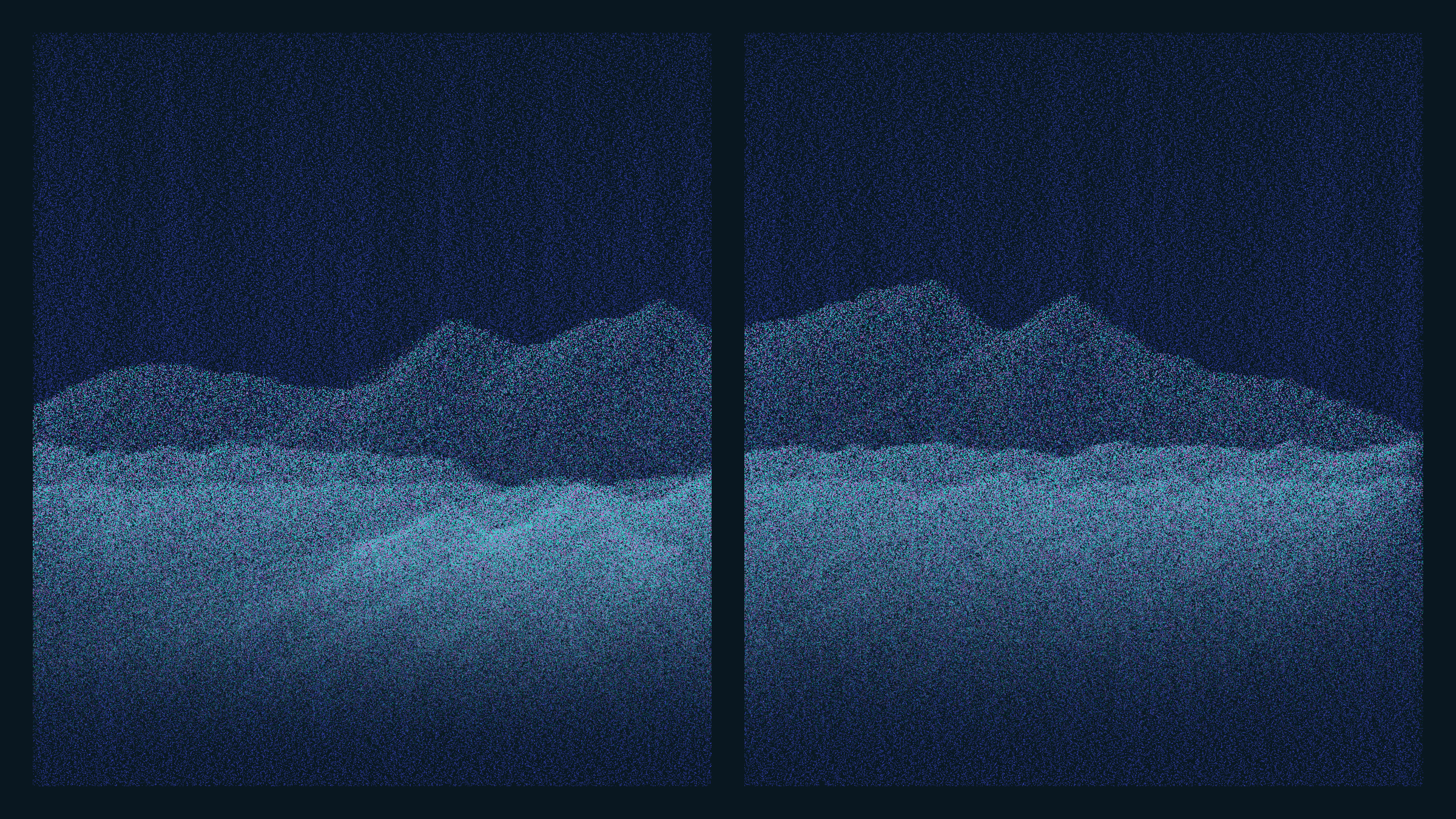 The Pointila algorithm first divides the canvas into columns. It then traverses the canvas dropping dots along those columns. From just a handful of layers, landscapes emerge. They take on a variety of forms: from rolling plains and steep canyons to jagged peaks and dreamy moors. Some are sharp and tense, others hazy and ethereal. They are coloured with handpicked palettes and animated with bold glitches – a nod to the shared optics of Pointillism and pixels.