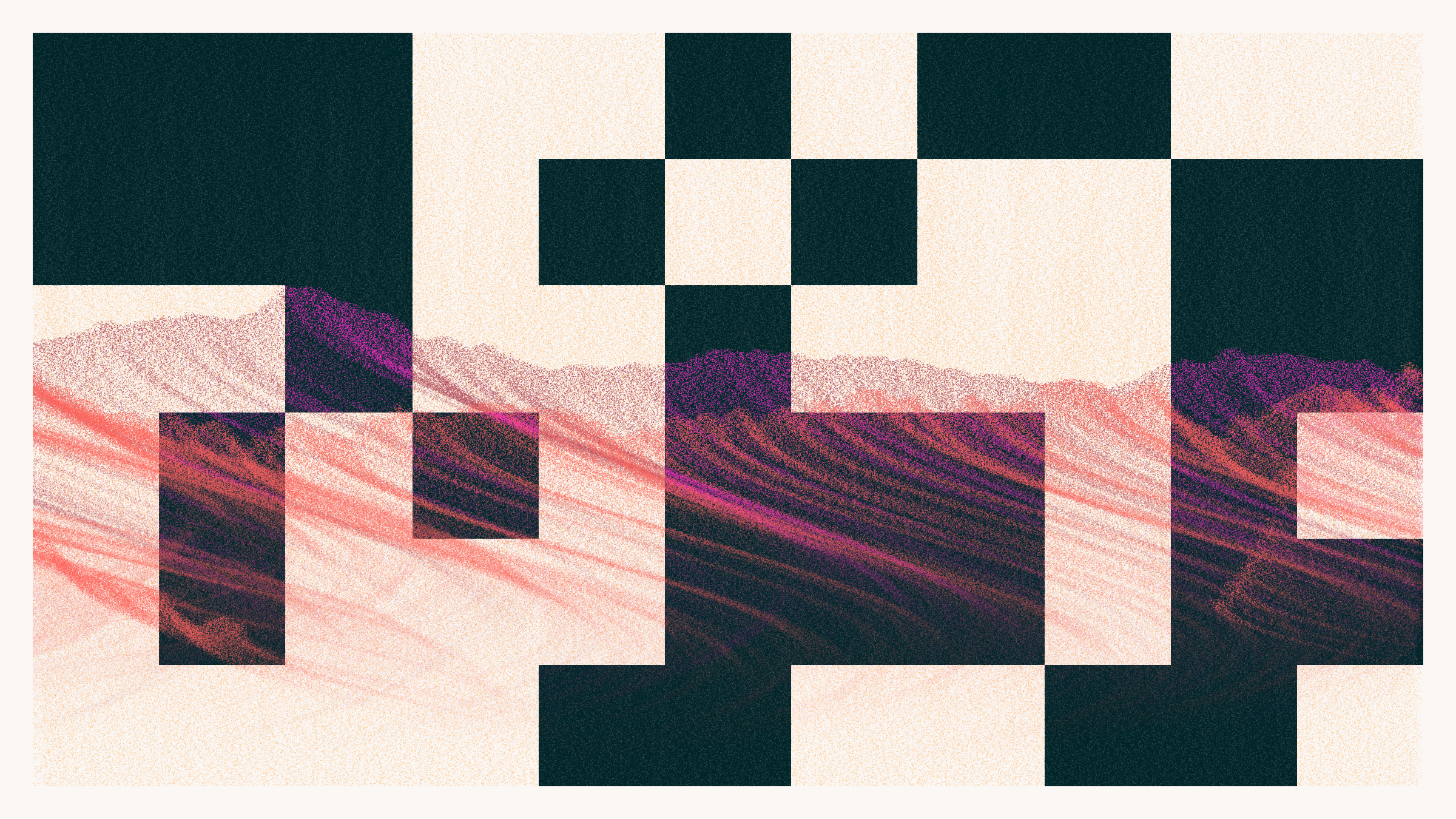 The Pointila algorithm first divides the canvas into columns. It then traverses the canvas dropping dots along those columns. From just a handful of layers, landscapes emerge. They take on a variety of forms: from rolling plains and steep canyons to jagged peaks and dreamy moors. Some are sharp and tense, others hazy and ethereal. They are coloured with handpicked palettes and animated with bold glitches – a nod to the shared optics of Pointillism and pixels.