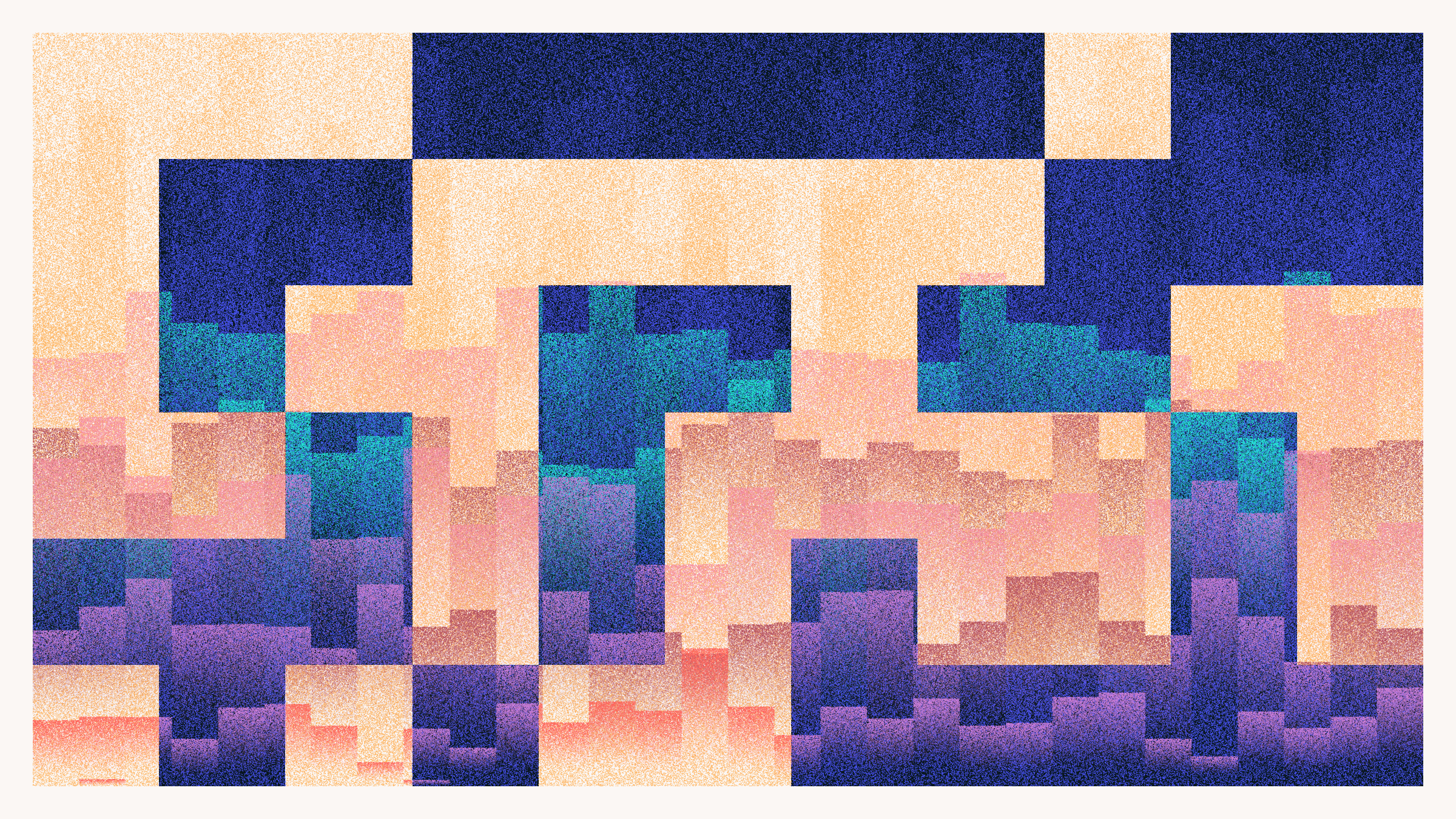 The Pointila algorithm first divides the canvas into columns. It then traverses the canvas dropping dots along those columns. From just a handful of layers, landscapes emerge. They take on a variety of forms: from rolling plains and steep canyons to jagged peaks and dreamy moors. Some are sharp and tense, others hazy and ethereal. They are coloured with handpicked palettes and animated with bold glitches – a nod to the shared optics of Pointillism and pixels.