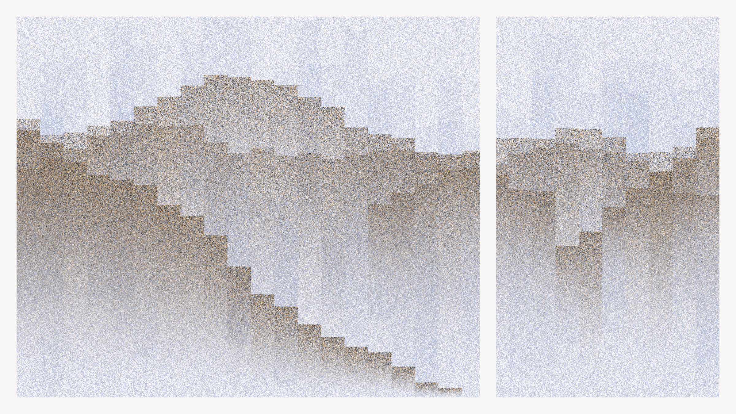 The Pointila algorithm first divides the canvas into columns. It then traverses the canvas dropping dots along those columns. From just a handful of layers, landscapes emerge. They take on a variety of forms: from rolling plains and steep canyons to jagged peaks and dreamy moors. Some are sharp and tense, others hazy and ethereal. They are coloured with handpicked palettes and animated with bold glitches – a nod to the shared optics of Pointillism and pixels.