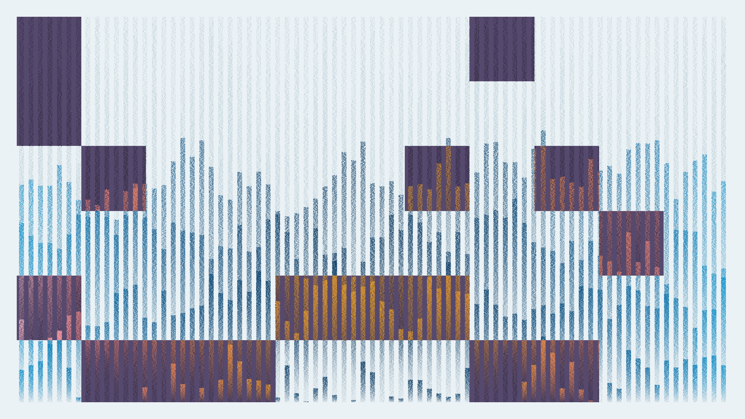 The Pointila algorithm first divides the canvas into columns. It then traverses the canvas dropping dots along those columns. From just a handful of layers, landscapes emerge. They take on a variety of forms: from rolling plains and steep canyons to jagged peaks and dreamy moors. Some are sharp and tense, others hazy and ethereal. They are coloured with handpicked palettes and animated with bold glitches – a nod to the shared optics of Pointillism and pixels.