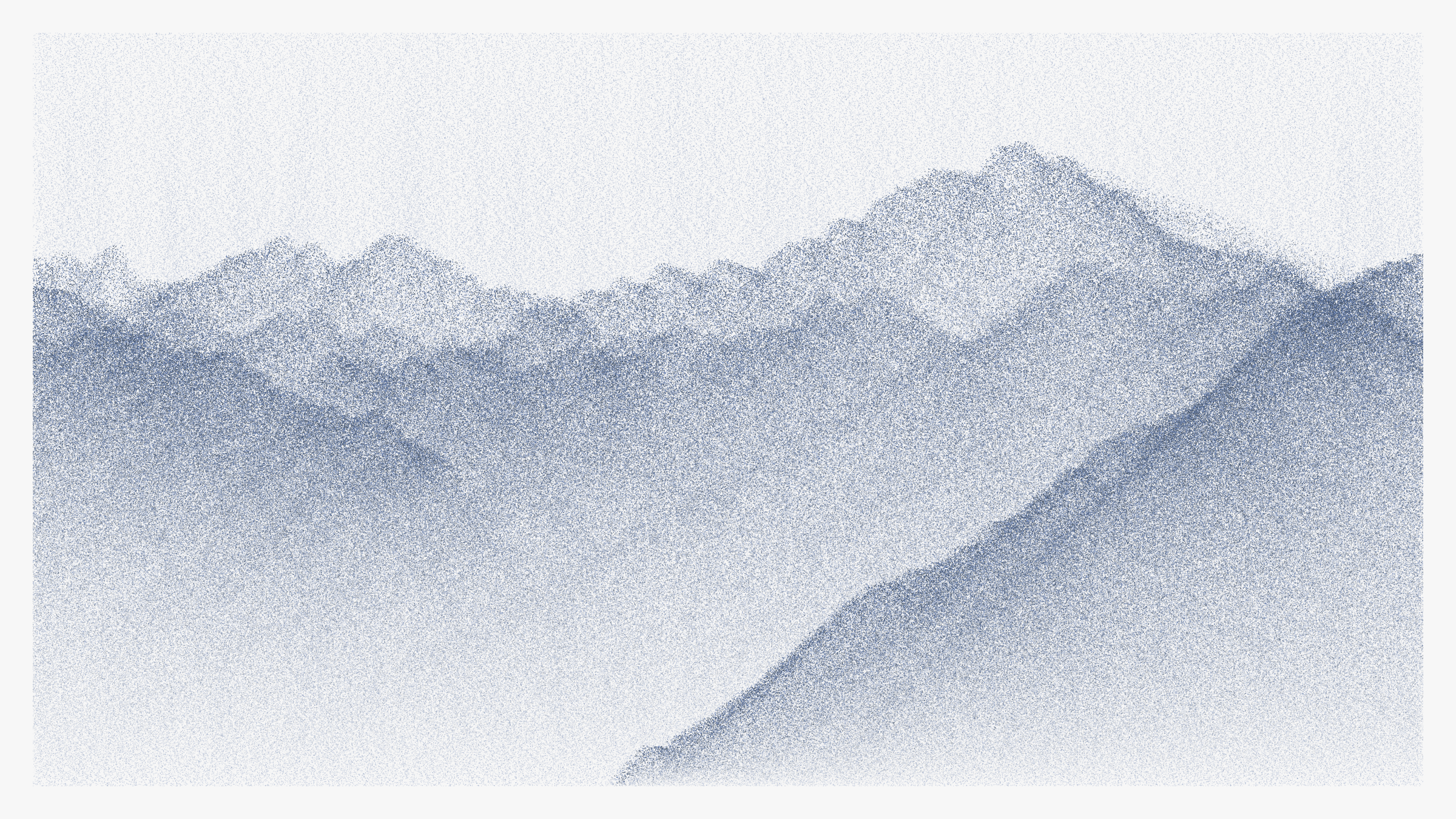 The Pointila algorithm first divides the canvas into columns. It then traverses the canvas dropping dots along those columns. From just a handful of layers, landscapes emerge. They take on a variety of forms: from rolling plains and steep canyons to jagged peaks and dreamy moors. Some are sharp and tense, others hazy and ethereal. They are coloured with handpicked palettes and animated with bold glitches – a nod to the shared optics of Pointillism and pixels.