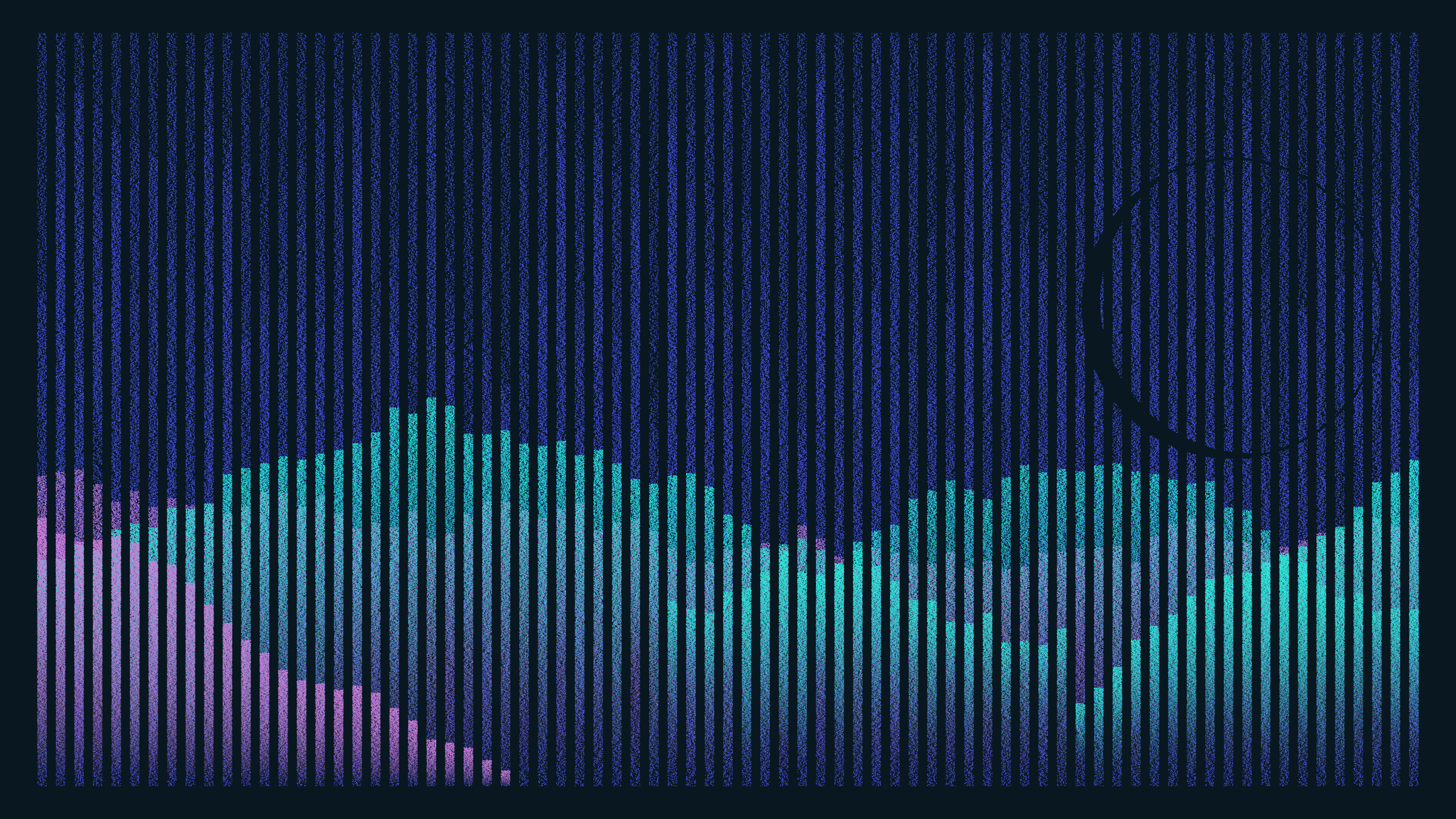 The Pointila algorithm first divides the canvas into columns. It then traverses the canvas dropping dots along those columns. From just a handful of layers, landscapes emerge. They take on a variety of forms: from rolling plains and steep canyons to jagged peaks and dreamy moors. Some are sharp and tense, others hazy and ethereal. They are coloured with handpicked palettes and animated with bold glitches – a nod to the shared optics of Pointillism and pixels.