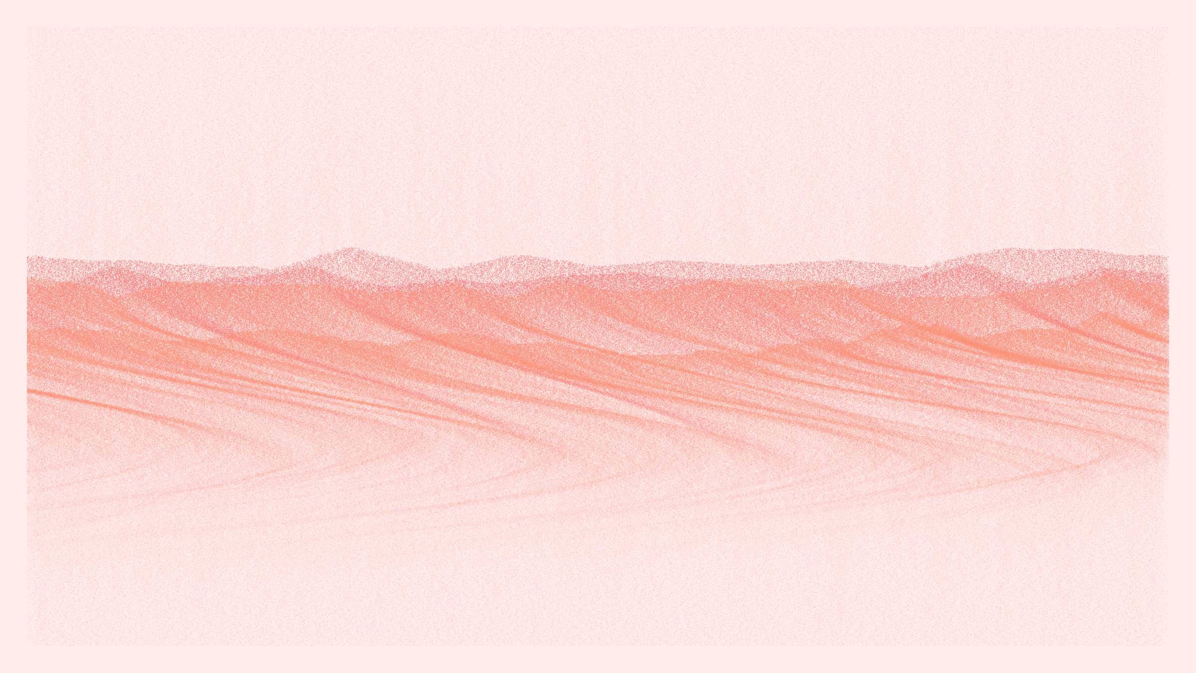 The Pointila algorithm first divides the canvas into columns. It then traverses the canvas dropping dots along those columns. From just a handful of layers, landscapes emerge. They take on a variety of forms: from rolling plains and steep canyons to jagged peaks and dreamy moors. Some are sharp and tense, others hazy and ethereal. They are coloured with handpicked palettes and animated with bold glitches – a nod to the shared optics of Pointillism and pixels.
