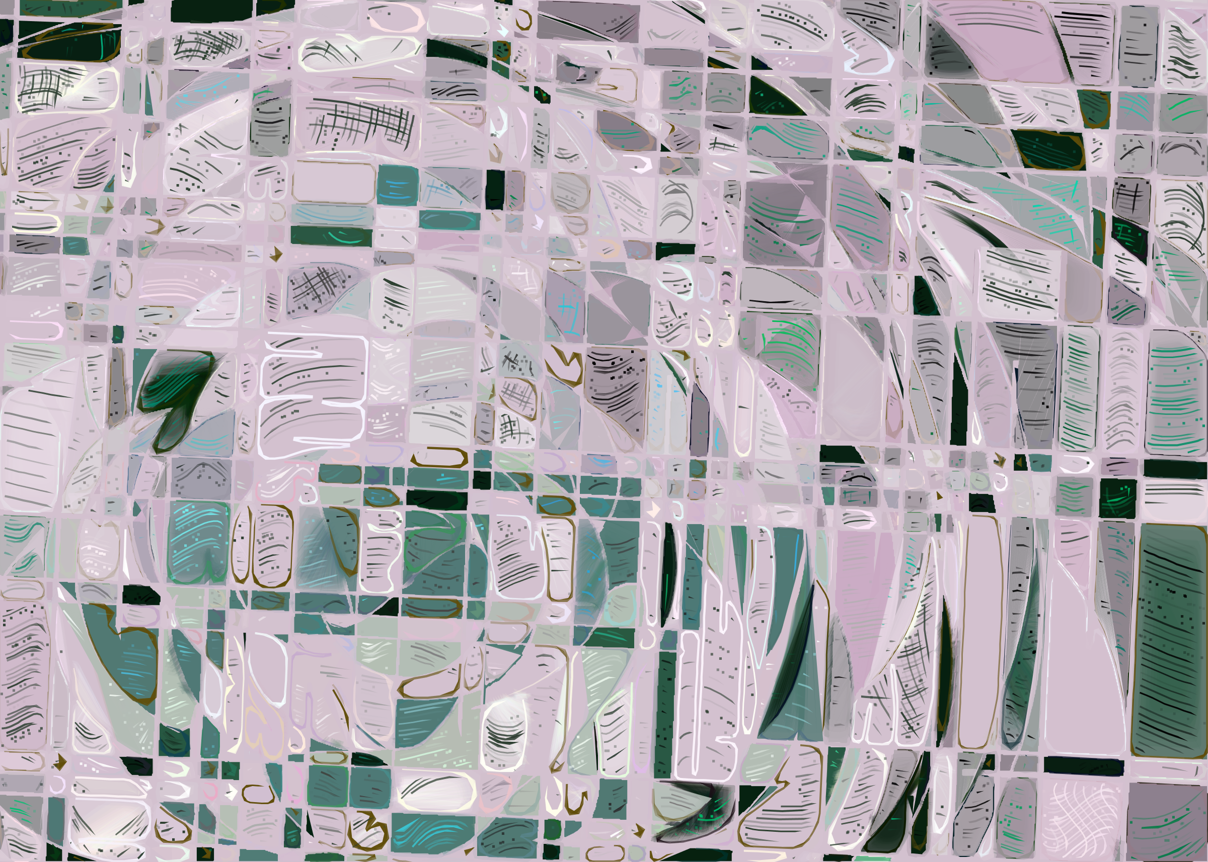 The rendering of **Running Moon** is inspired by stained glass and watercolor. It captures the sharpness of the glass and the softness of light using abstract forms. As organic shapes gradually expand to fill the space, brush-pen-like stripes solder these pieces together to form intricate compositions.
