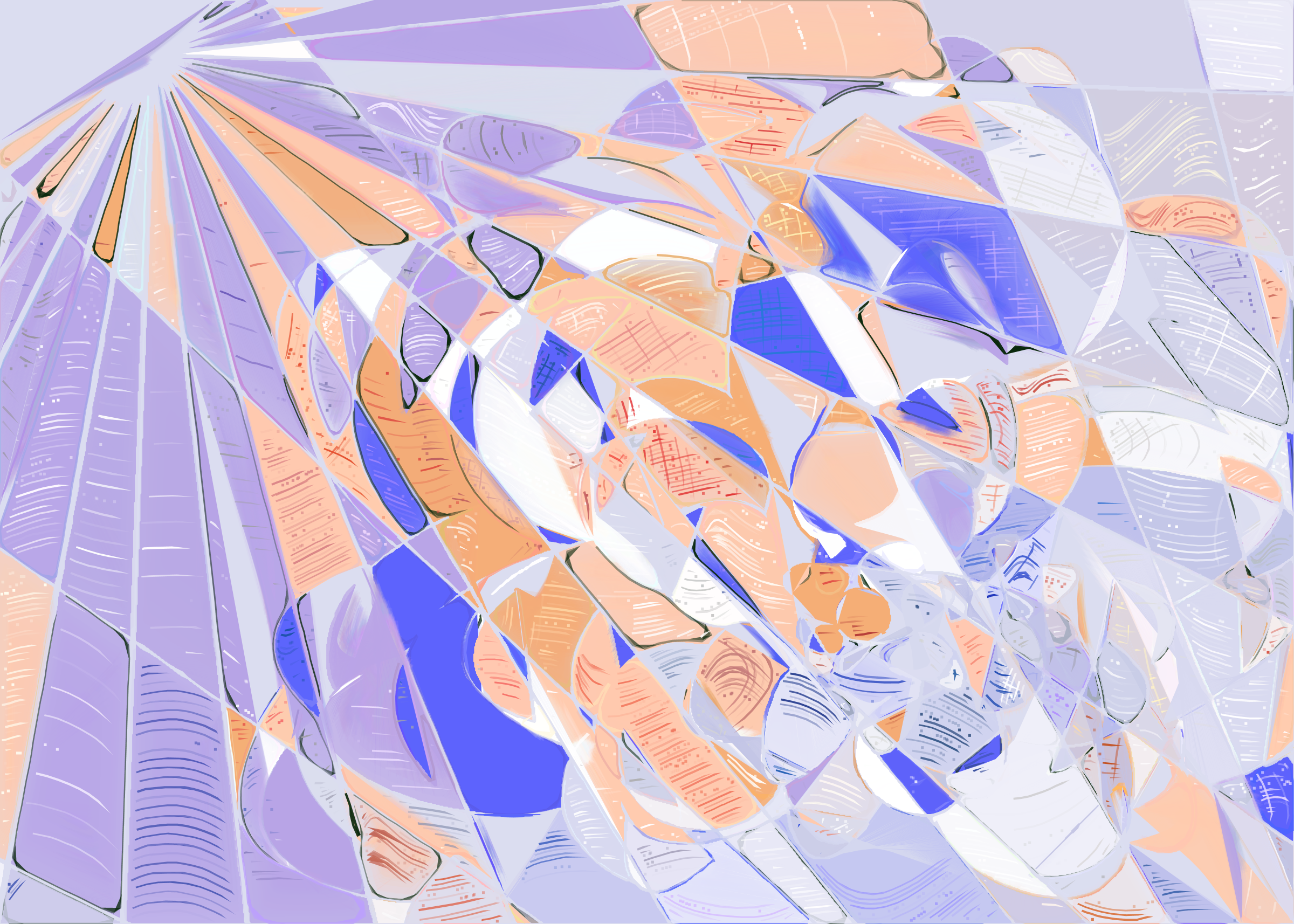 The rendering of **Running Moon** is inspired by stained glass and watercolor. It captures the sharpness of the glass and the softness of light using abstract forms. As organic shapes gradually expand to fill the space, brush-pen-like stripes solder these pieces together to form intricate compositions.