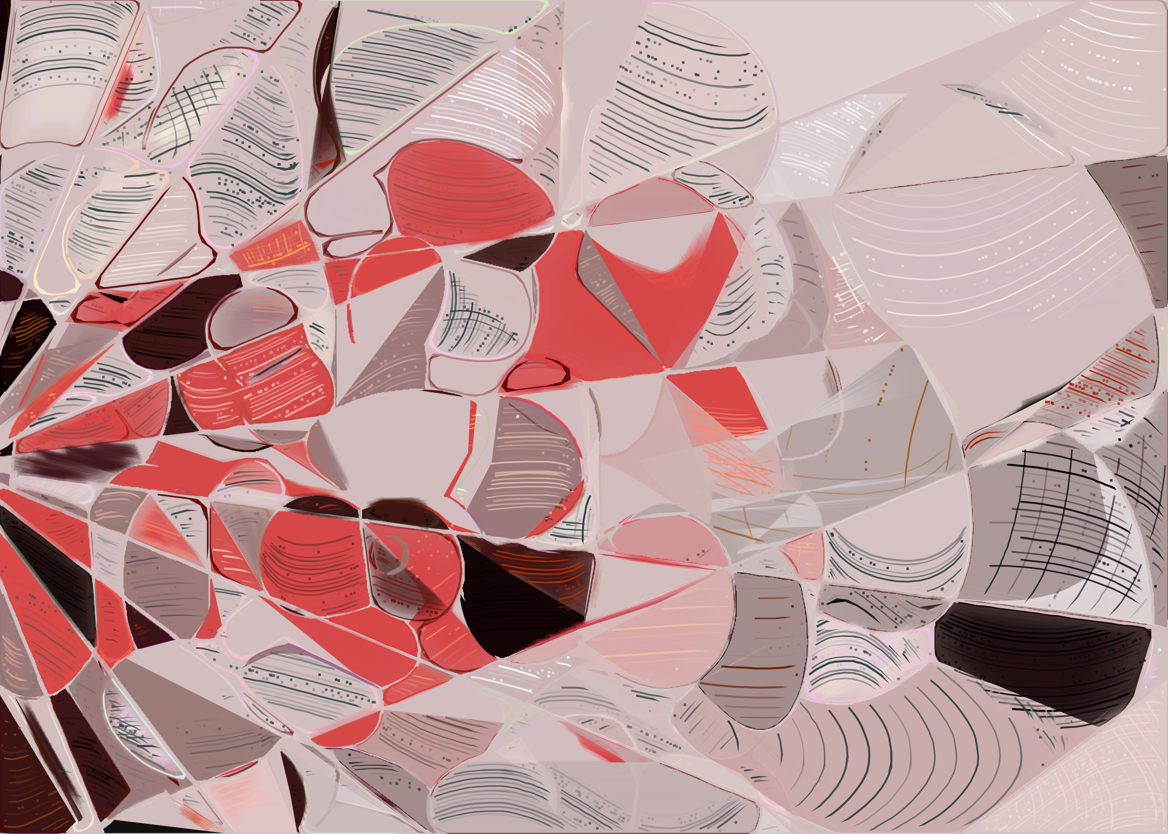 The rendering of **Running Moon** is inspired by stained glass and watercolor. It captures the sharpness of the glass and the softness of light using abstract forms. As organic shapes gradually expand to fill the space, brush-pen-like stripes solder these pieces together to form intricate compositions.