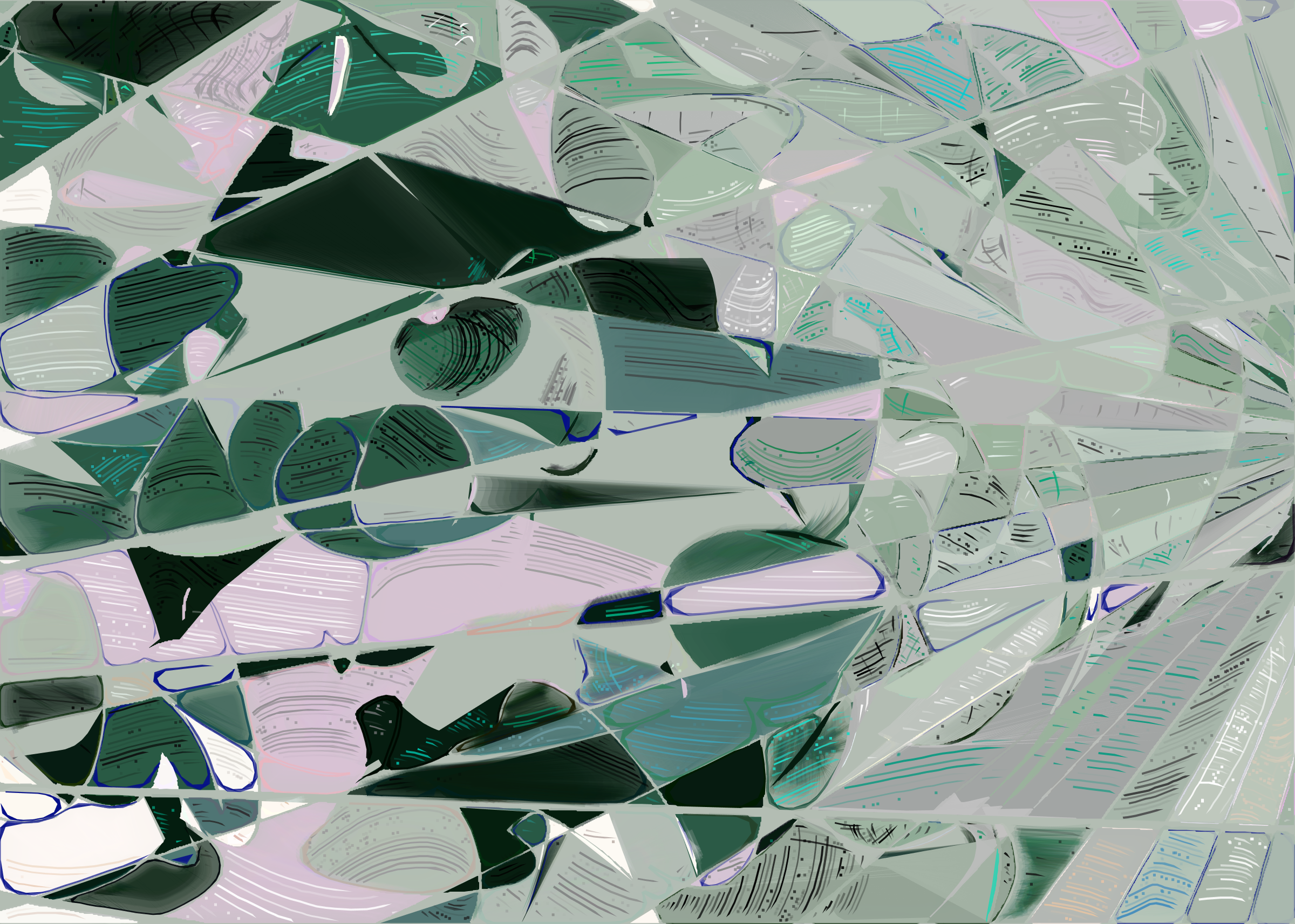 The rendering of **Running Moon** is inspired by stained glass and watercolor. It captures the sharpness of the glass and the softness of light using abstract forms. As organic shapes gradually expand to fill the space, brush-pen-like stripes solder these pieces together to form intricate compositions.